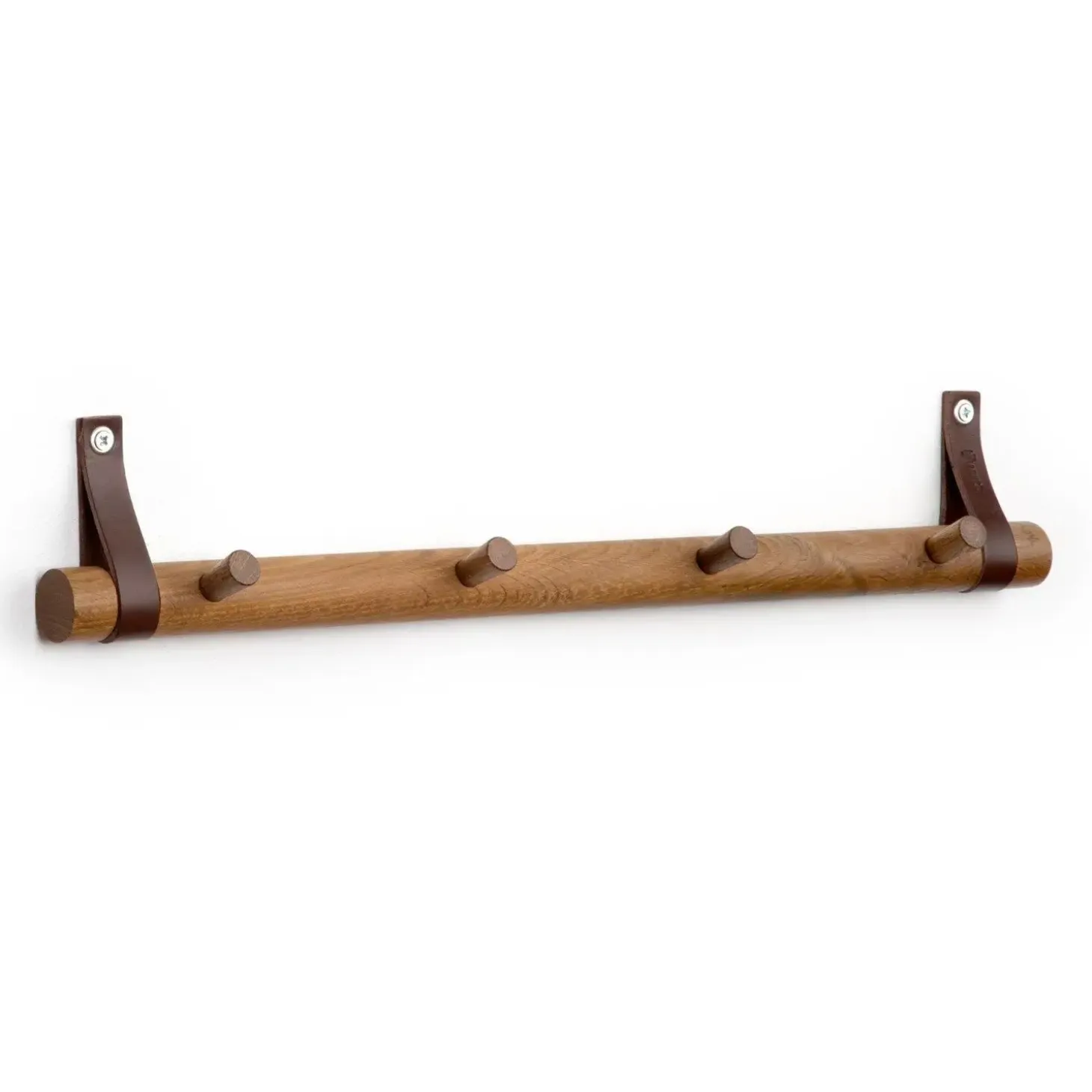 Denne knagerække er omhyggeligt fremstillet i røget eg, et naturligt materiale, der bringer varme og karakter ind i dit hjem. Med mørke stropper til montering i hver ende får du en stabil og sikker vægmontering, der holder dine jakker og tasker på plads.