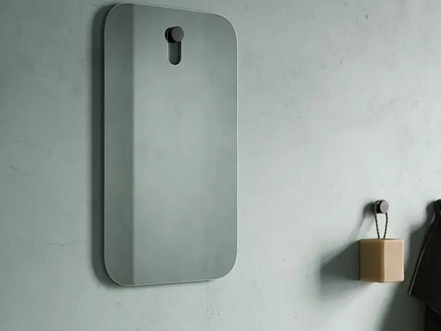 Dette rektangulære spejl leveres med en Wood Knot small i natur eg, der fungerer som ophæng og tilføjer en naturlig detalje. Spejlet måler 30×50 cm med afrundede hjørner og en dybde på 6 mm, hvilket giver en slank profil, der passer til minimalistiske rum.