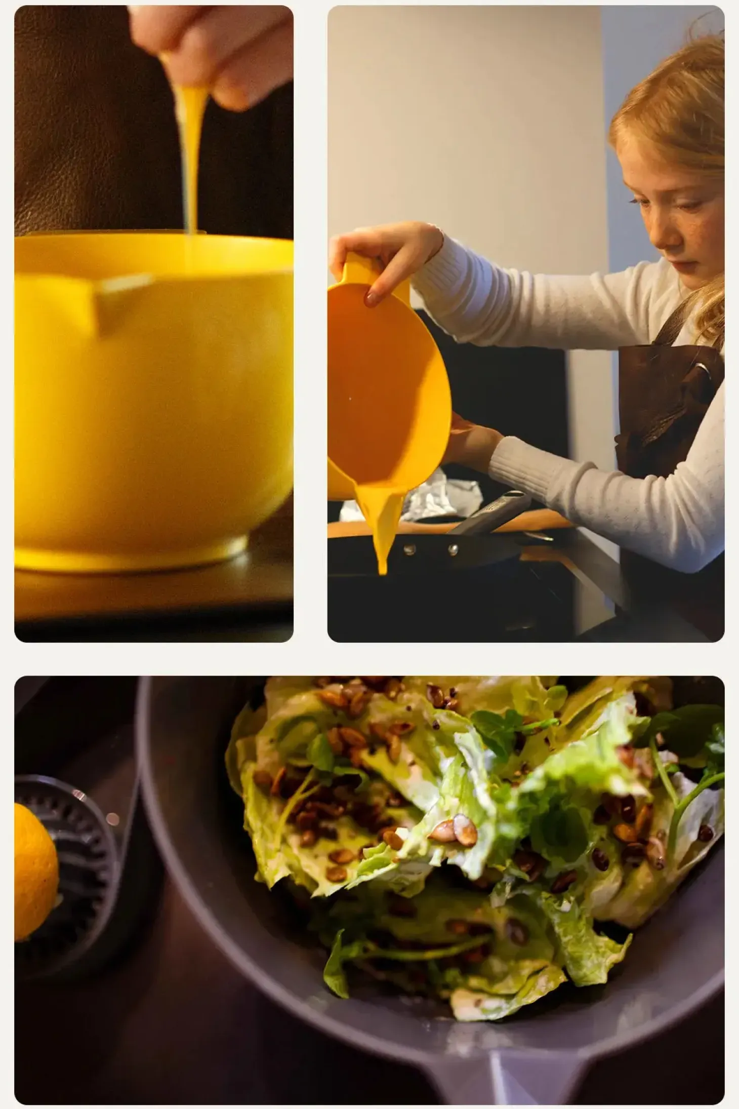 Skålenes tud er designet til at gøre det let at hælde ingredienser over i serveringsfade uden at spilde. Dette gør madlavningen mere effektiv og mindre rodet, hvilket er en stor fordel i et aktivt køkkenmiljø.
