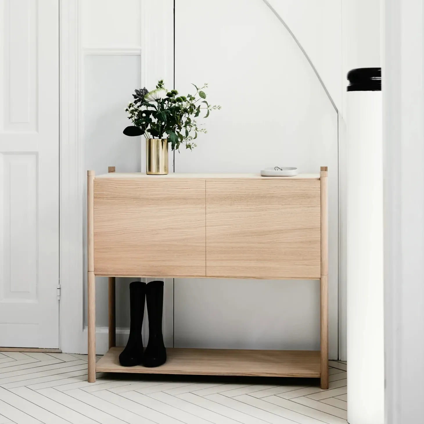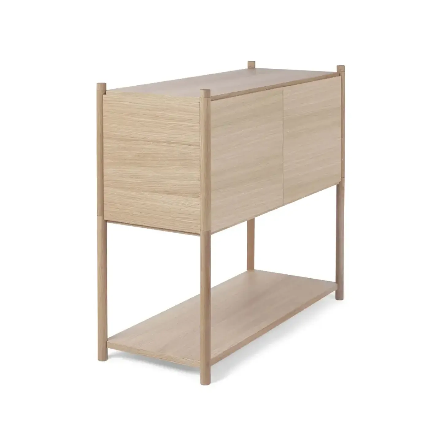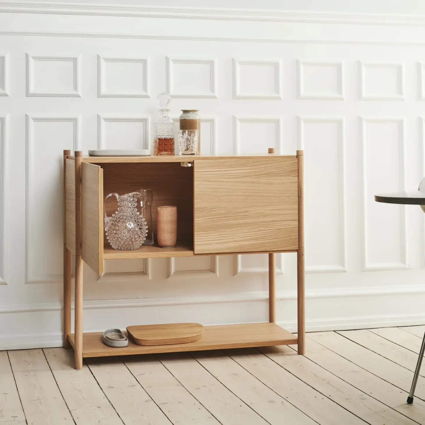 Super fin reol fra Gejst. Sceene reol c er et modulopbygget reolsystem, som giver en mulighed for at skabe sin egen personlige reol. Du kan være kreativ og skabe en opbevarings løsning, der passer præcis til de behov du har. Reolen er lavet således, at det øverste modul har fået tilføjet to sidepaneler, et bagpanel og frontlågerne kan åbnes op.