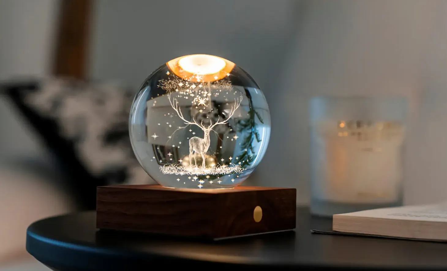 Denne bordlampe kombinerer kunstnerisk design med praktisk belysning. Krystallen indeholder en 3D-laserindgraveret hjort, der lyser op, når lampen tændes. Basen er skabt af FSC-certificeret valnøddetræ, hvilket sikrer bæredygtighed og holdbarhed. Lampen måler 8 x 9,5 cm og vejer 756 g.