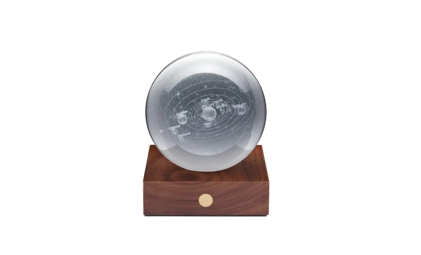 Denne krystallampe fremhæver solsystemets planeter og kredsløb gennem poleret glas. Valnøddetræsbunden rummer et genopladeligt batteri, der giver op til 16 timers lys på en enkelt opladning. Højden er 12 cm, hvilket gør den velegnet til bogreoler og natborde.