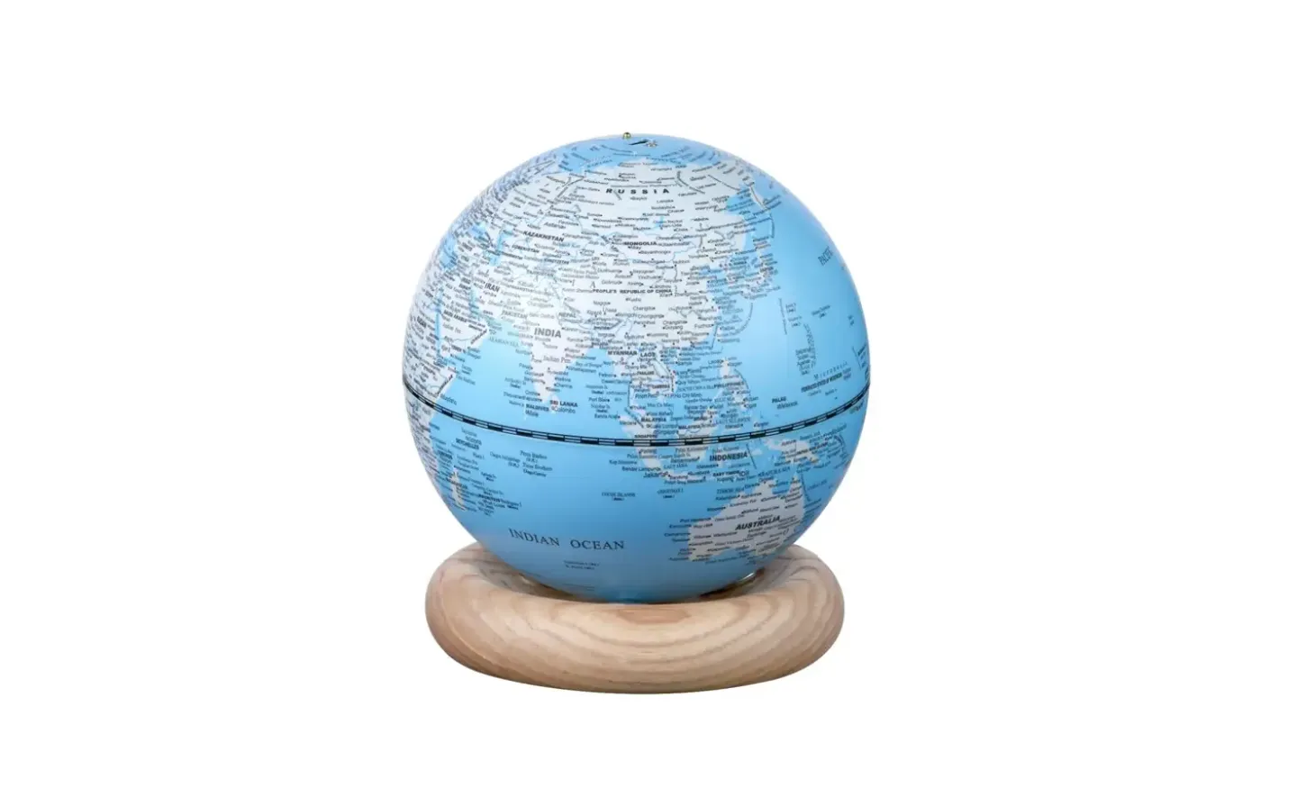 - Lyseblå globe med detaljerede kortmarkeringer på overfladen