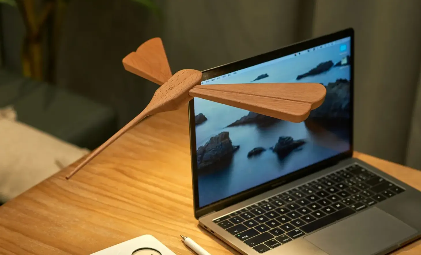 Denne lampe er laserskåret af ahorn og kombinerer kunstnerisk design med funktionel belysning. Designet ligner en guldsmed med udstrakte vinger, der balancerer på en cylindrisk base. LED-lysene er skjult under vingerne og giver en blød, elegant belysning, mens lampen kan rotere for en ekstra interaktiv dimension.
