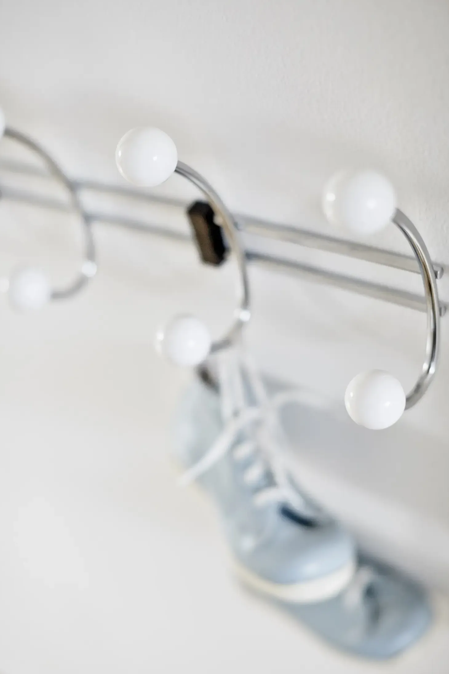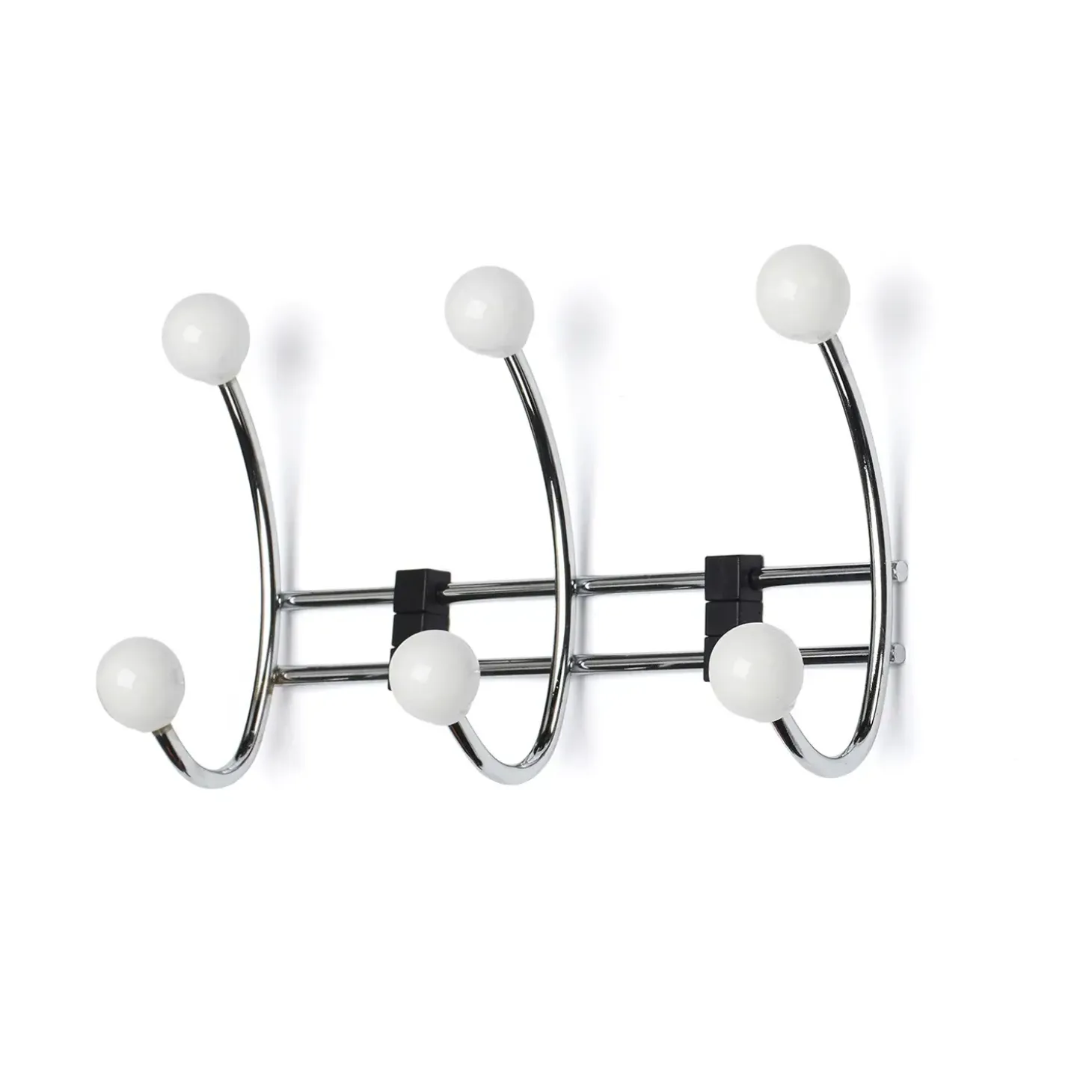 Knagerække med 3 knager i blank forkromet stål med hvide porcelæns knopper.