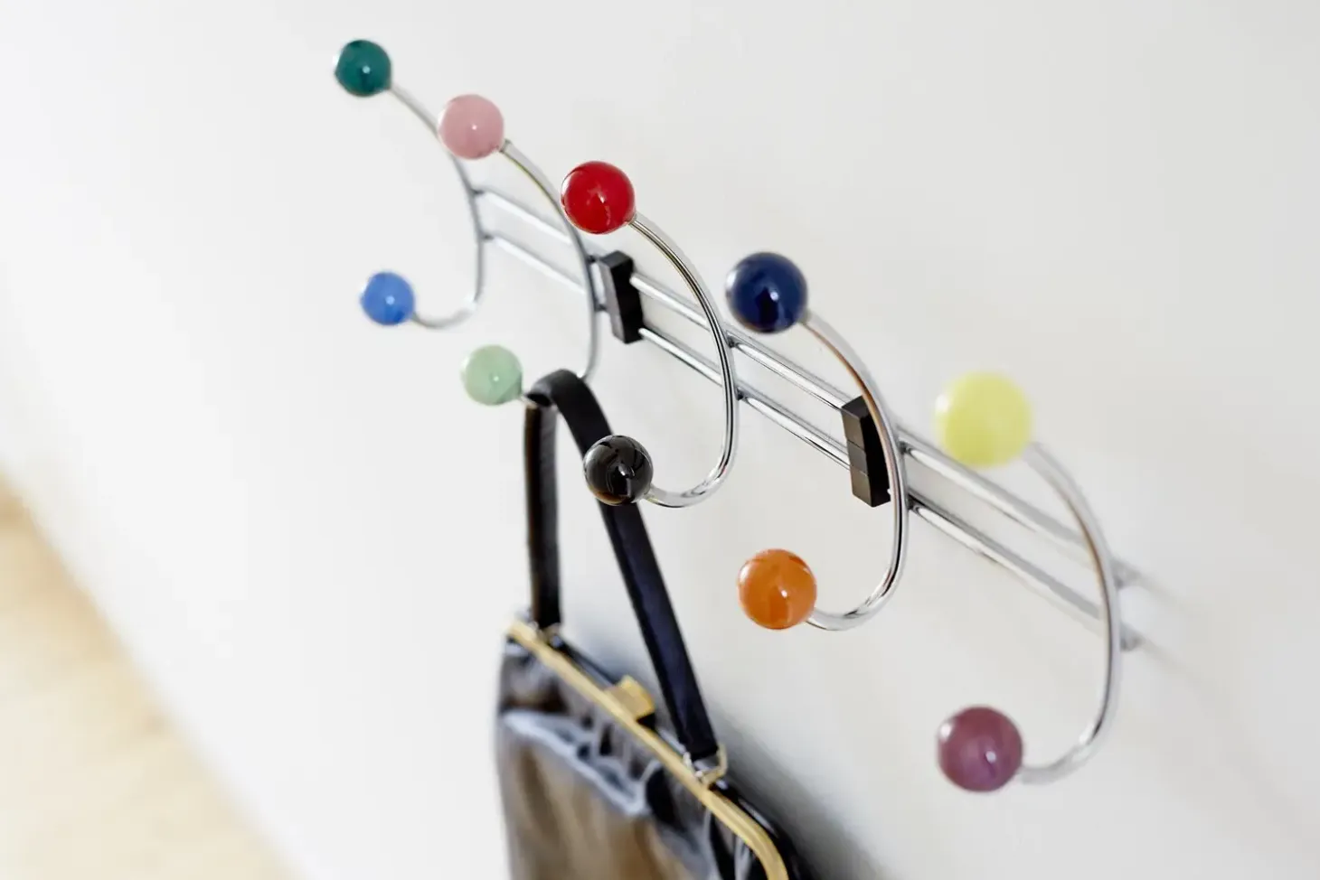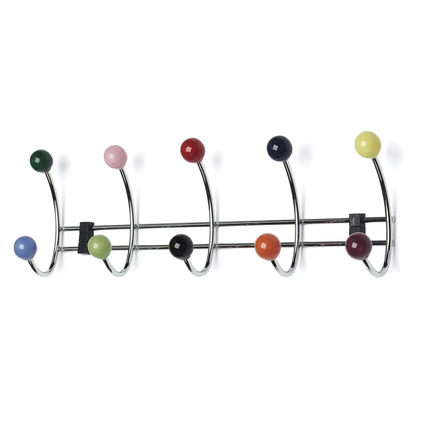 Knagerække med 5 knager i blank forkromet stål med flerfarvet porcelæns knopper.