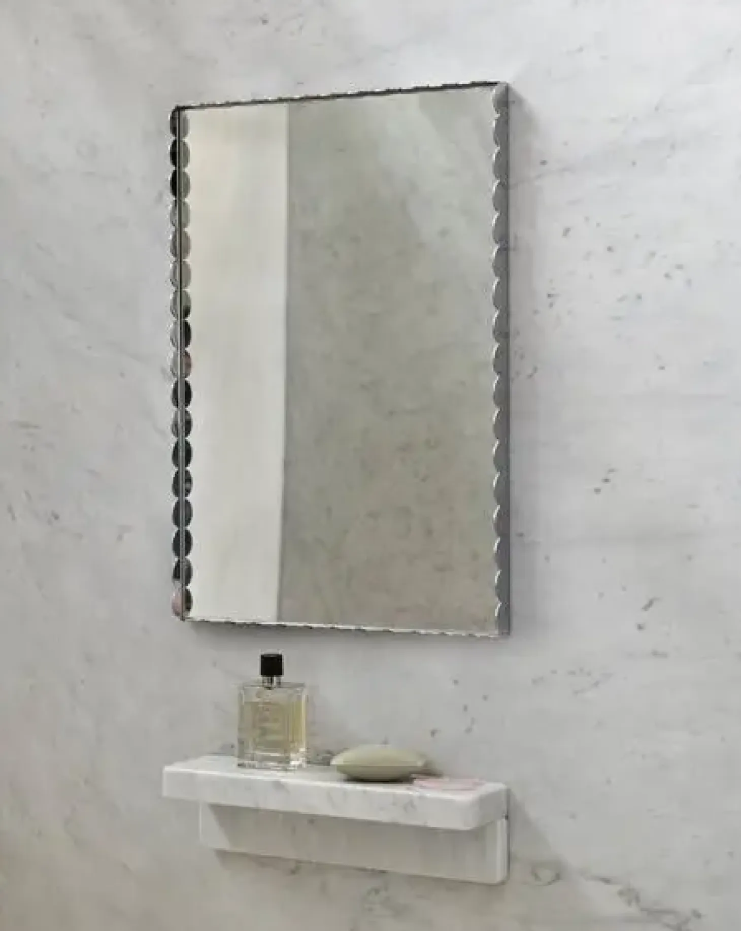 Den bølgede kant skaber en fin balance mellem det funktionelle og det dekorative. Spejlets størrelse gør det velegnet til forskellige rum i hjemmet, hvor du ønsker at tilføje både funktionalitet og et designmæssigt element.