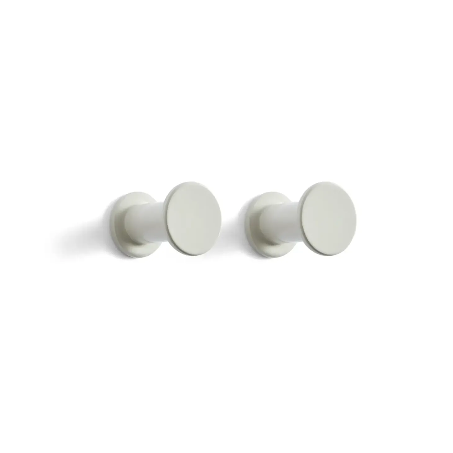 Dette sæt fra Hay giver dig to lysegrå vægknager i et minimalistisk design. Med deres runde frontstykker og cylindriske form tilbyder knagerne både funktionalitet og stilren æstetik til din væg.