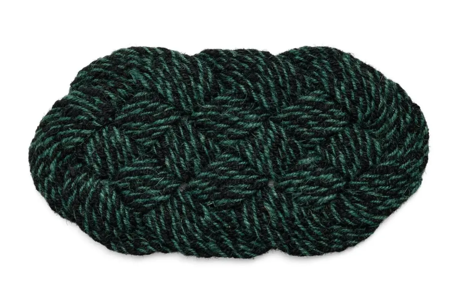 Den ovale form giver et blødere udtryk end traditionelle rektangulære måtter. Svulmønstret i grøn og sort skaber dybde og karakter, mens det naturlige kokosmateriale effektivt fjerner snavs og fugt fra skoene.