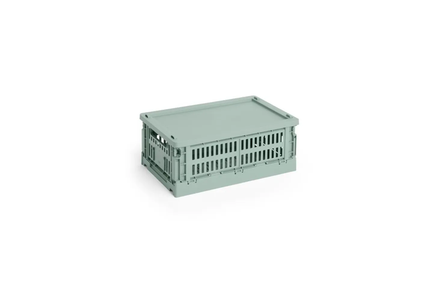 Den sagegrønne nuance og det karakteristiske perforerede design giver dig en opbevaringsløsning, der både er praktisk og æstetisk tiltalende. Kassens størrelse er ideel til mindre genstande, kontorartikler eller køkkenredskaber.