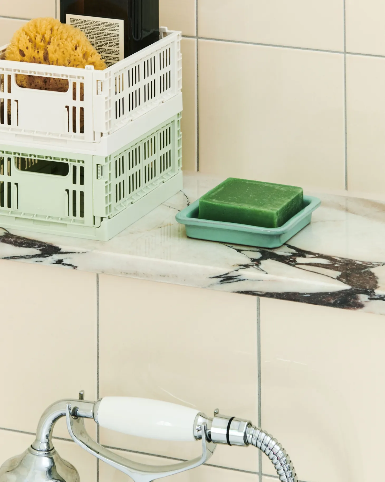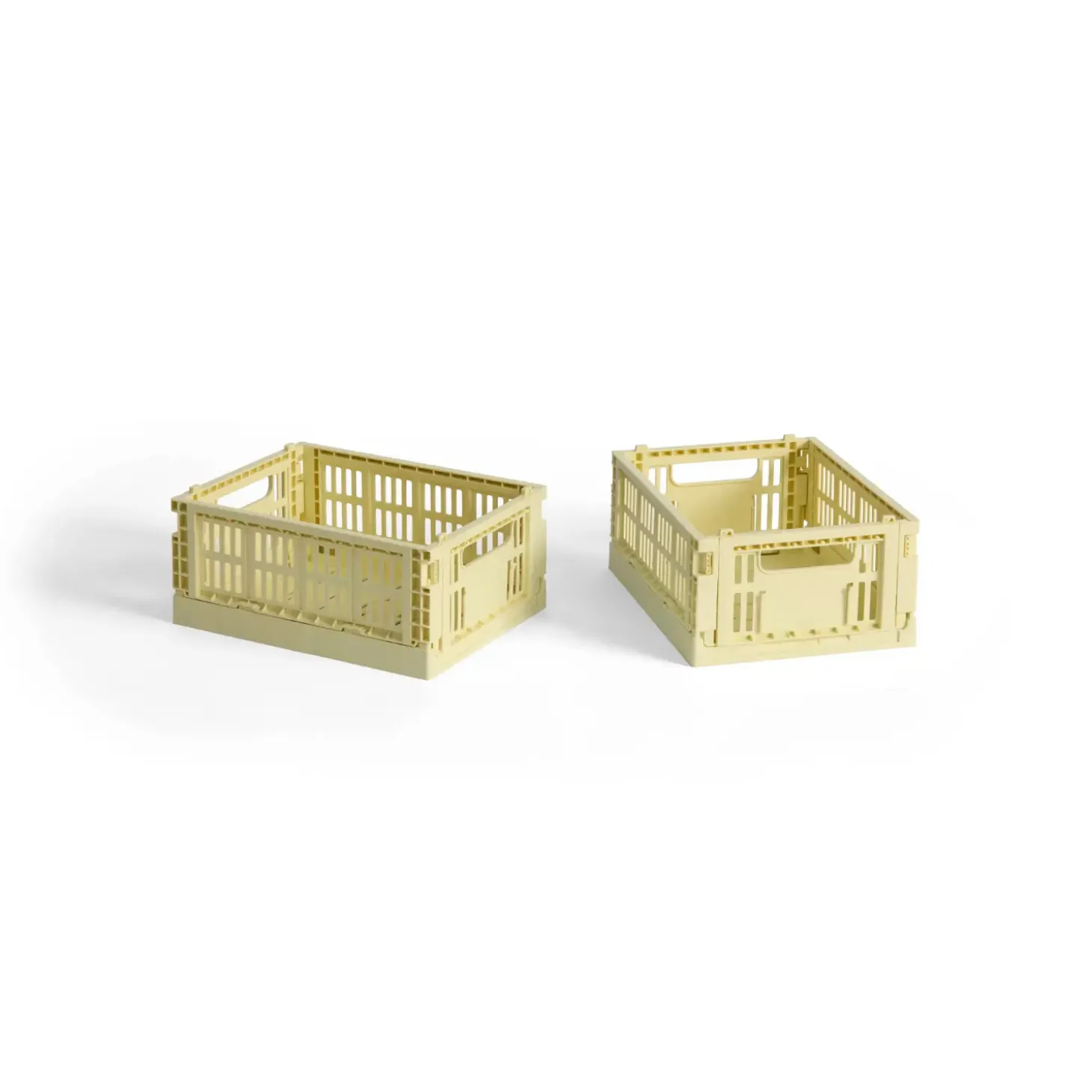 Mini-opbevaringskasser i lys gul nuance, fremstillet af 100 % genanvendt plastik fra husholdningsaffald. To kompakte kasser med foldbart design, der sparer plads, når de ikke er i brug.