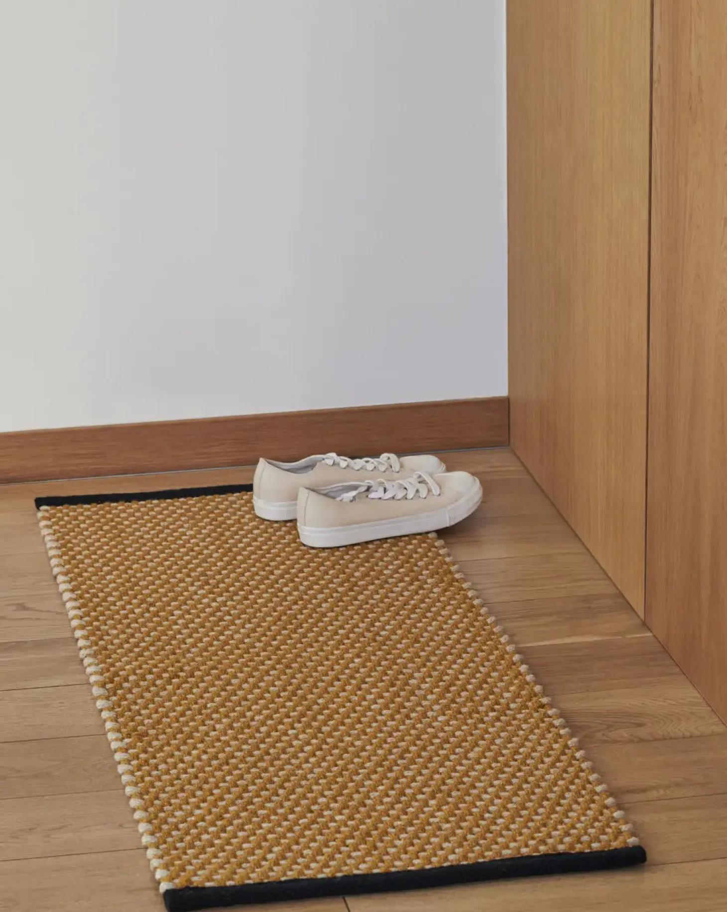 Den okker/gule farve med sorte kontrastkanter skaber et karakteristisk udtryk i din entré. Kombinationen af uld og jute giver ikke kun en slidstærk overflade, men bidrager også til måttens naturlige og indbydende udseende.