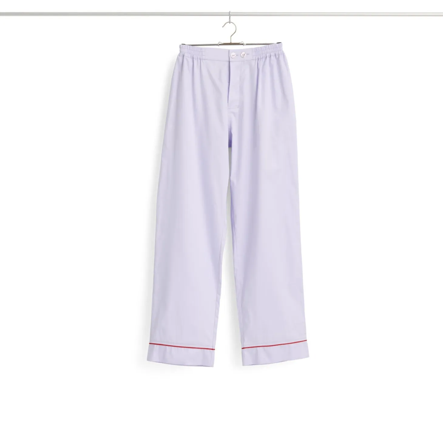 Disse pyjamasbukser fra HAY har en lavendel hovedfarve med røde detaljer ved kanten. De er fremstillet i blød bomuld og fås i størrelse M/L for en afslappet pasform. Bukserne giver dig komfort og stil til dine nætter.