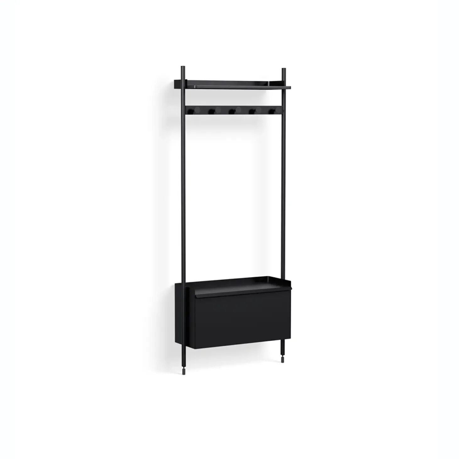 Den enkelte kolonne gør reolen ideel til mindre rum, hvor du ønsker at maksimere opbevaringspladsen. Skabsenheden i bunden giver dig mulighed for at gemme ting væk, mens krogene er praktiske til ophængning af jakker eller tasker.