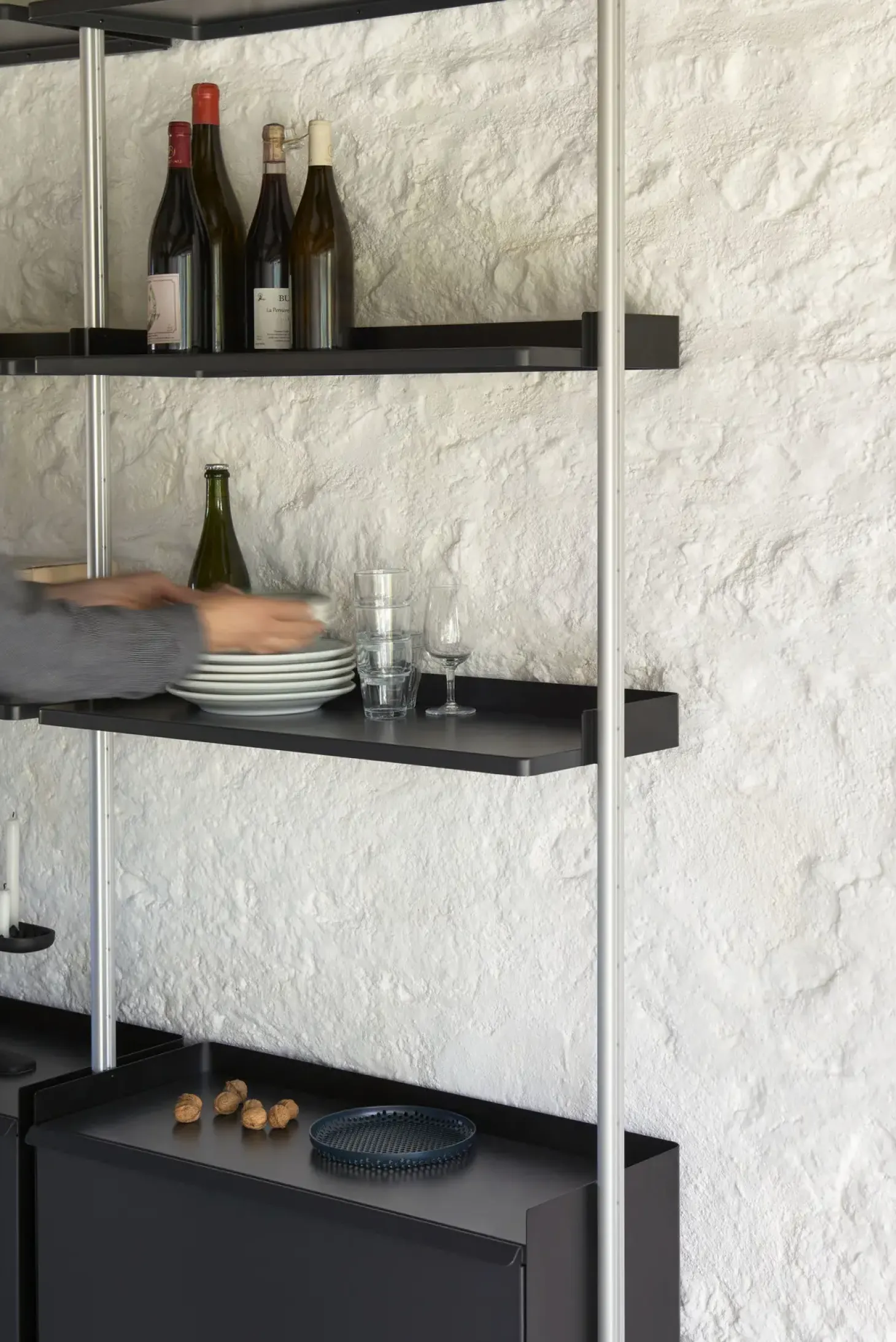 Dette reolsystem fra Hay giver dig mulighed for at skabe din egen opbevaringsløsning. Med tre sorte hylder monteret på lodrette metalstænger får du en stabil og praktisk reol, der passer til både hjemmet og kontoret.