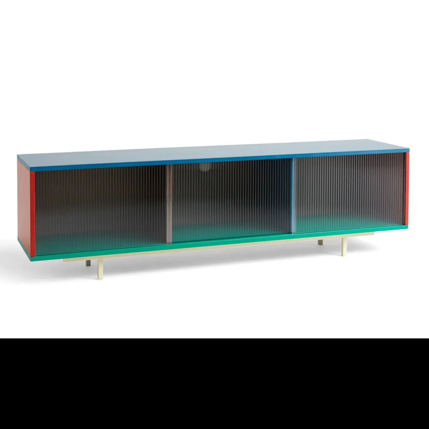 Dette gulvskab fra Hay kombinerer holdbart Valchromat-MDF og FSC-certificeret stål med et karakteristisk flerfarvet design. De rummelige mål på 180 cm i bredden giver dig god plads til opbevaring af dine ting bag de stilfulde glaslåger.