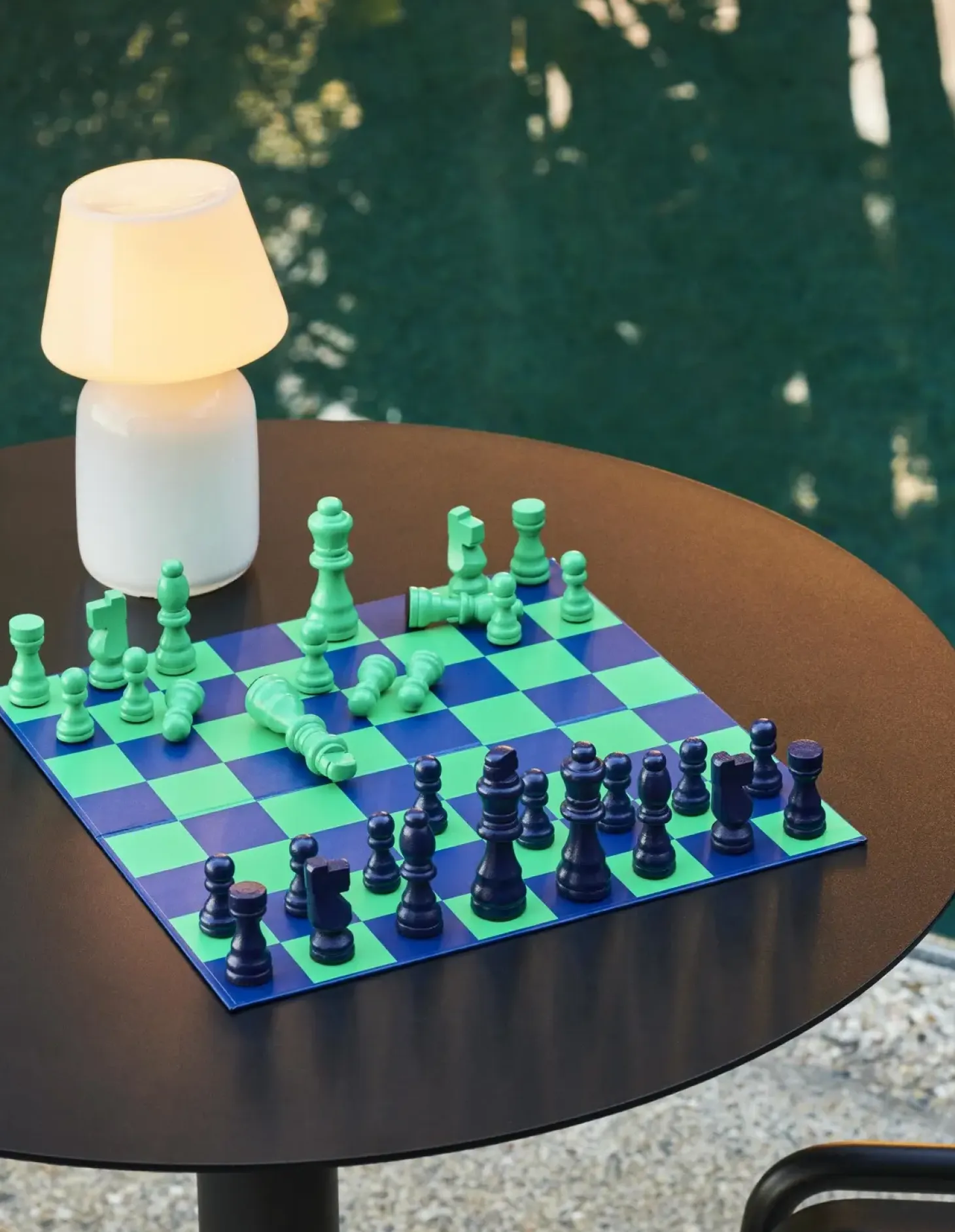 Skakbrættet har en gennemtænkt konstruktion med blå og grønne felter, der giver god kontrast under spillet. De lysegrønne og mørkeblå brikker er nemme at skelne fra hinanden, hvilket gør hver træk tydelig og præcis.
