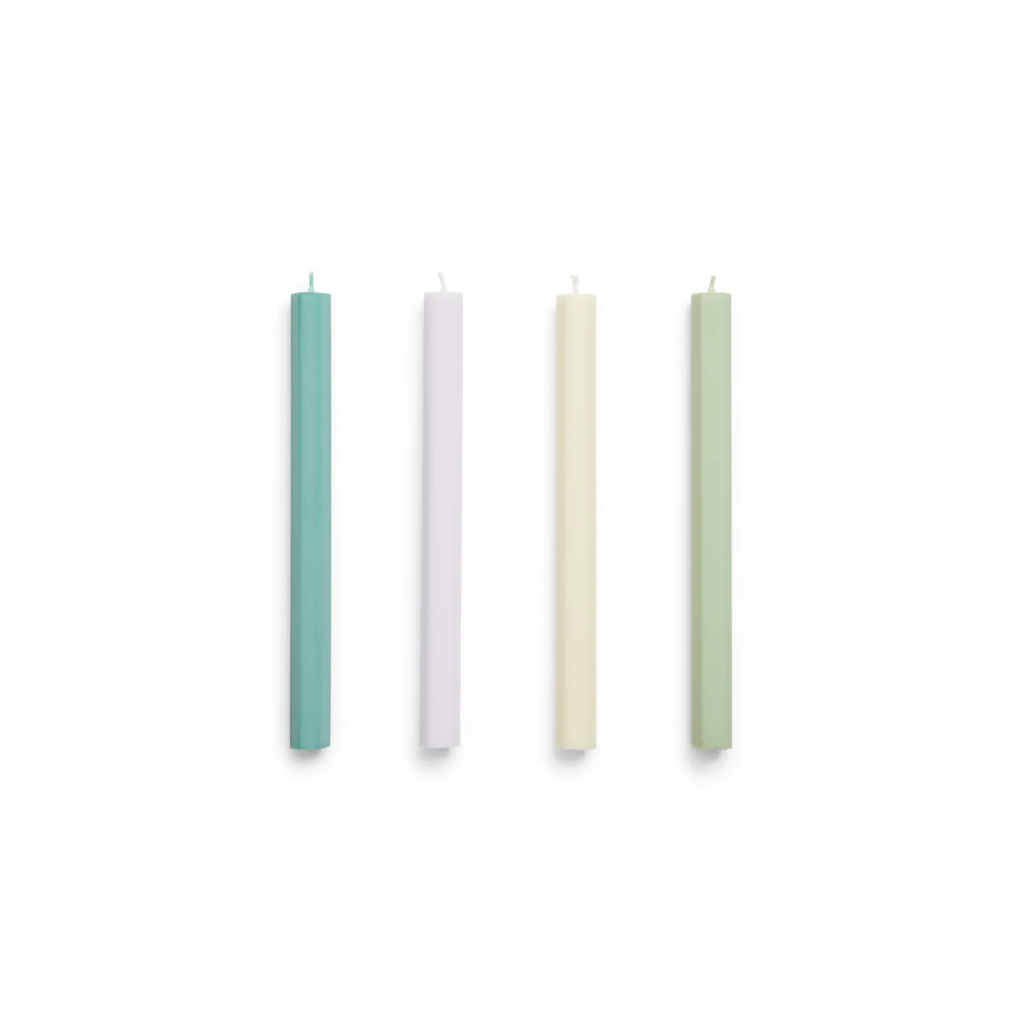 Fire sekskantede stearinlys i forskellige pastelfarver med mat finish. Den geometriske form og de bløde farver giver dig mulighed for at style lysene individuelt eller samlet. Lysene er fremstillet af kvalitetsmaterialer for en jævn og ren forbrænding.