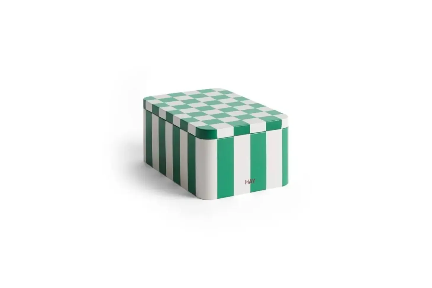 Denne tinbeholder fra HAY kombinerer praktisk opbevaring med et karakteristisk design. Det skakternede mønster på låget og de lodrette striber i grøn og off-white skaber en særlig visuel dynamik i dit hjem.