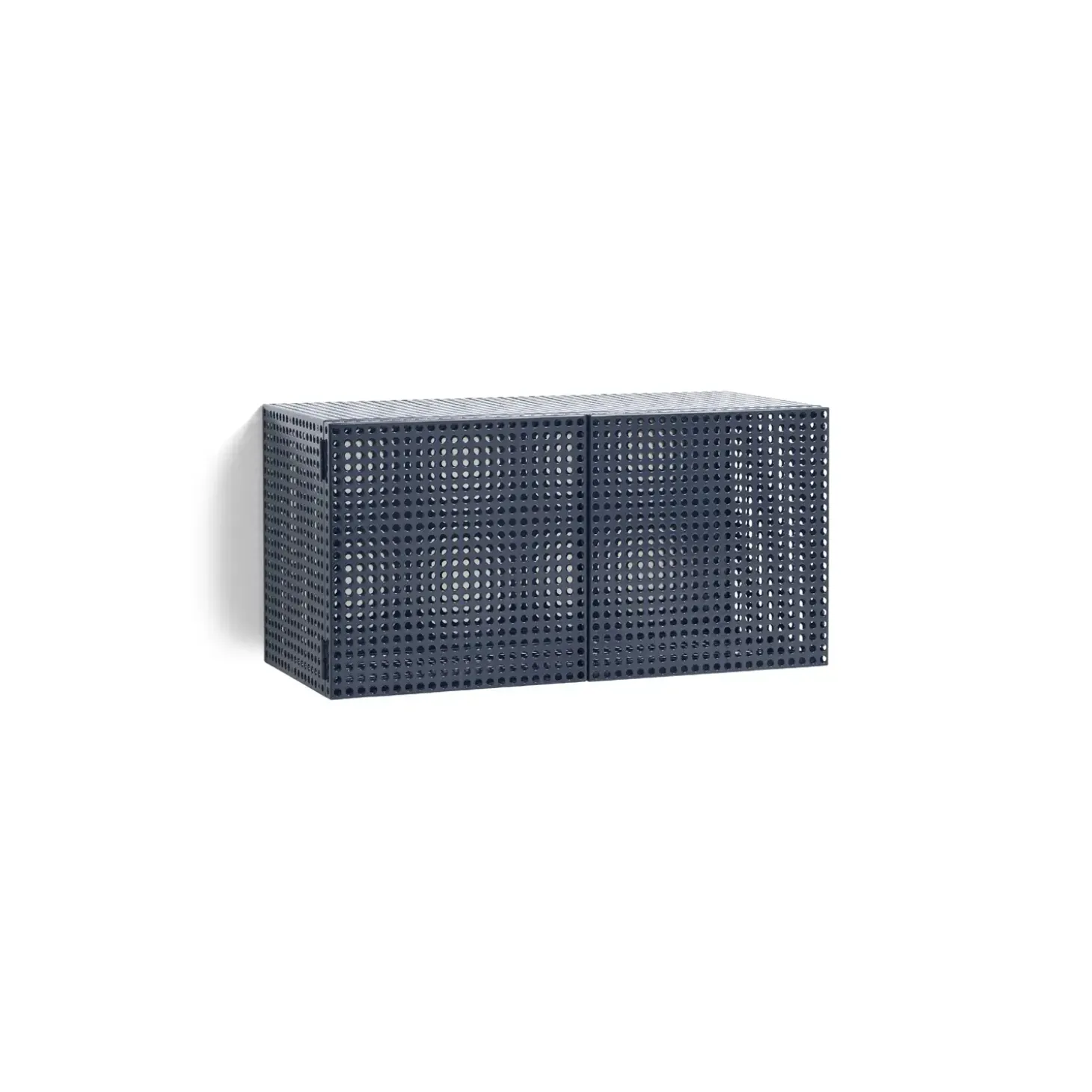 Dette vægmonterede skab fra Hay kombinerer holdbart stål med et karakteristisk perforeret design. Den stålblå finish og de præcise mål på H45 x B89 x D40 cm giver dig en praktisk opbevaringsløsning til din væg.