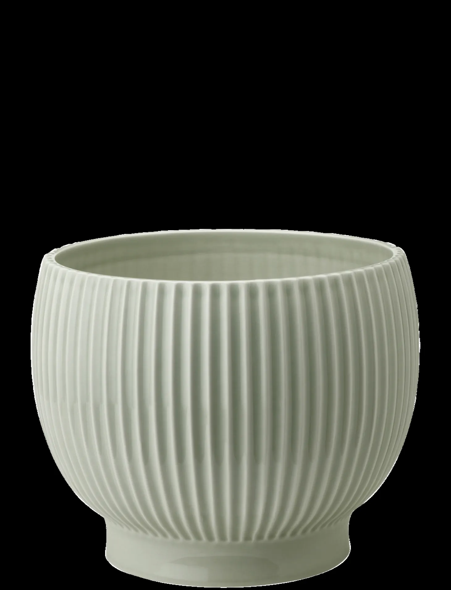 Denne urtepotteskjuler byder på et vertikalt ribbet mønster, der giver den karakter og dybde. Den blanke finish og moderne glasur er en del af Knabstrups nutidige produktionsteknikker, som bygger på en lang tradition inden for keramikfremstilling.