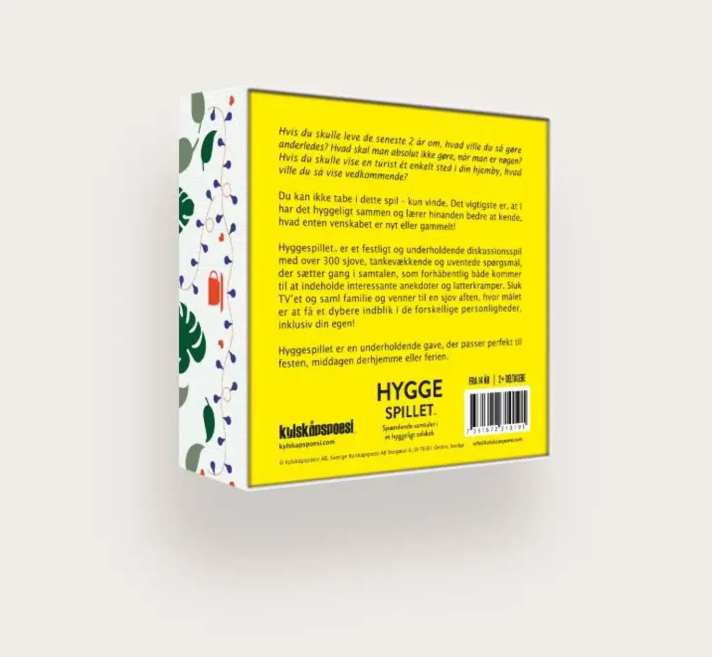 Hyggespillet er et festligt og underholdende diskussionsspil med over 300 sjove, tankevækkende og uventede spørgsmål, der sætter gang i samtalen, som forhåbentlig både kommer til at indeholde interessante anekdoter og latterkramper. Sluk TV’et og saml familie og venner til en sjov aften, hvor målet er at få et dybere indblik i de forskellige personligheder, inklusiv din egen!