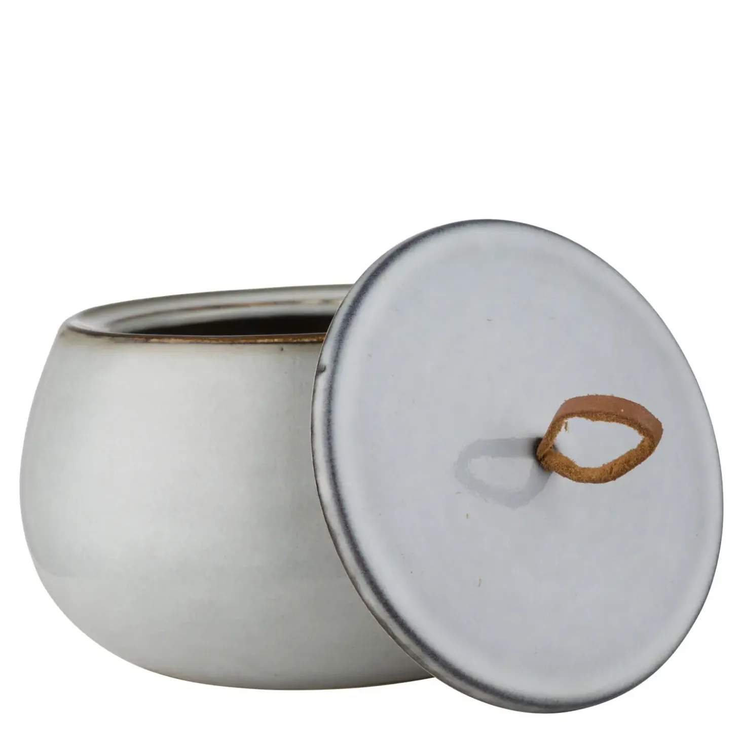 Fin krukke i grå stentøj. Krukken måler L11,5xB11,5xH7,5 cm. og kan indeholde 40 cl. Krukken er en del af Amera serien. Charmen og kendetegnet for produkterne i Amera serien er, at produkterne er belagt med dobbelt reaktiv glasur. Dette betyder af der kan forekomme variationer i farve og udseende fra produkt til produkt. OBS: Krukken tåler mikroovn og opvaskemaskine.