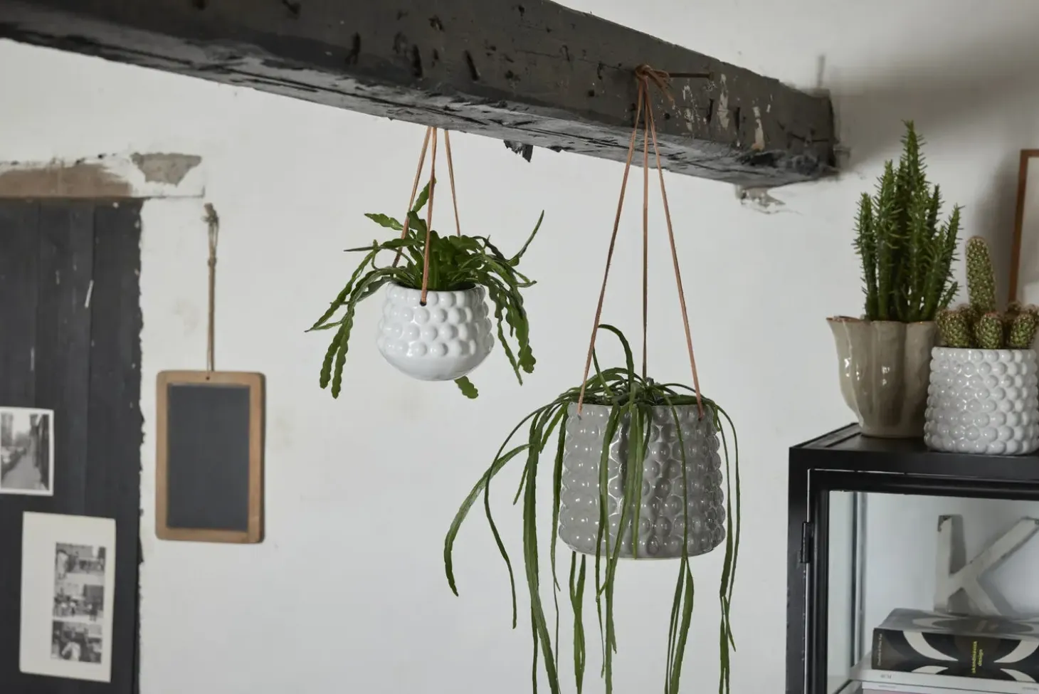 Denne smukke Dotsie keramiske hængekrukke med tre fine lædersnore til ophængning skaber en skøn stemning i ethvert hjem. Løft dine planter eller blomster og mærk en vidunderlig atmosfære i rummet.