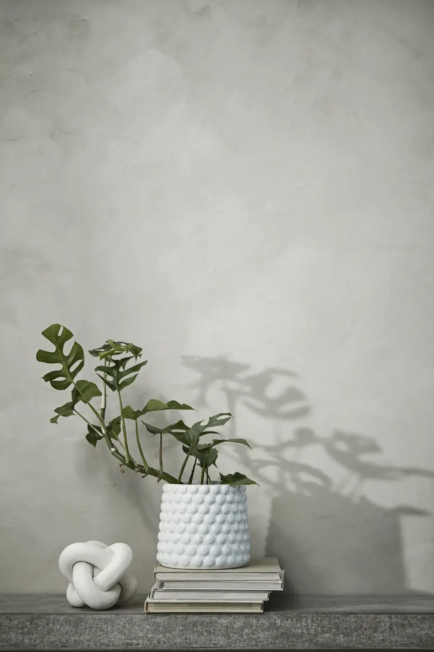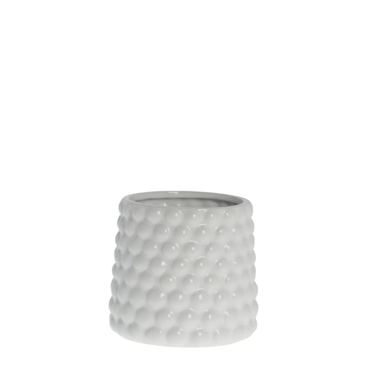 Dotsie urtepotteskjuleren kombinerer klassisk hvid keramik med et moderne, tekstureret ydre. Den blanke overflade reflekterer lyset smukt og giver dine planter en elegant ramme. Skjuleren er et dekorativt element, der kan fremhæve forskellige typer potteplanter i hjemmet.