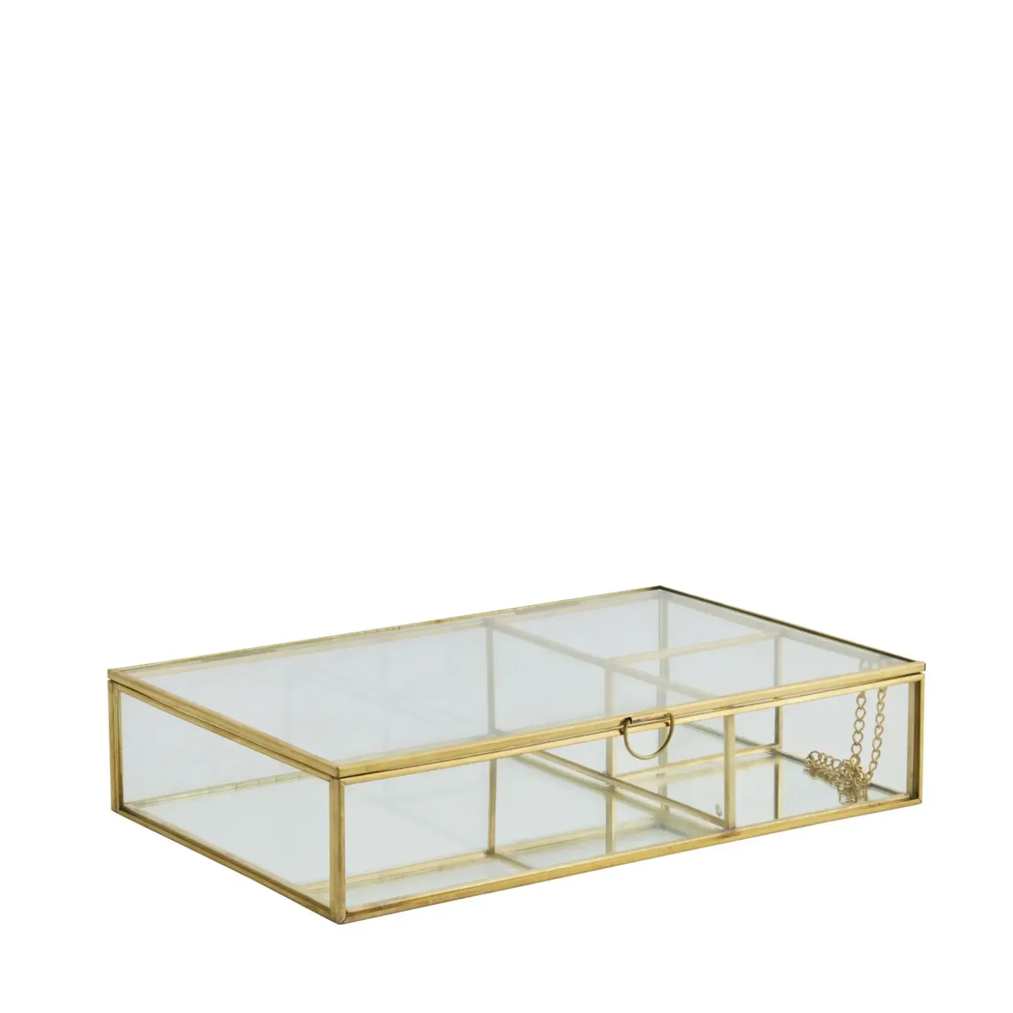 Denne opbevaringsboks er håndlavet af glas og metal. Dens smukke guldfinish er både tidløst og elegant. Det gennemsigtige glas giver et klart udsyn til dine værdsatte smykker, der er pænt organiseret og beskyttet indeni.