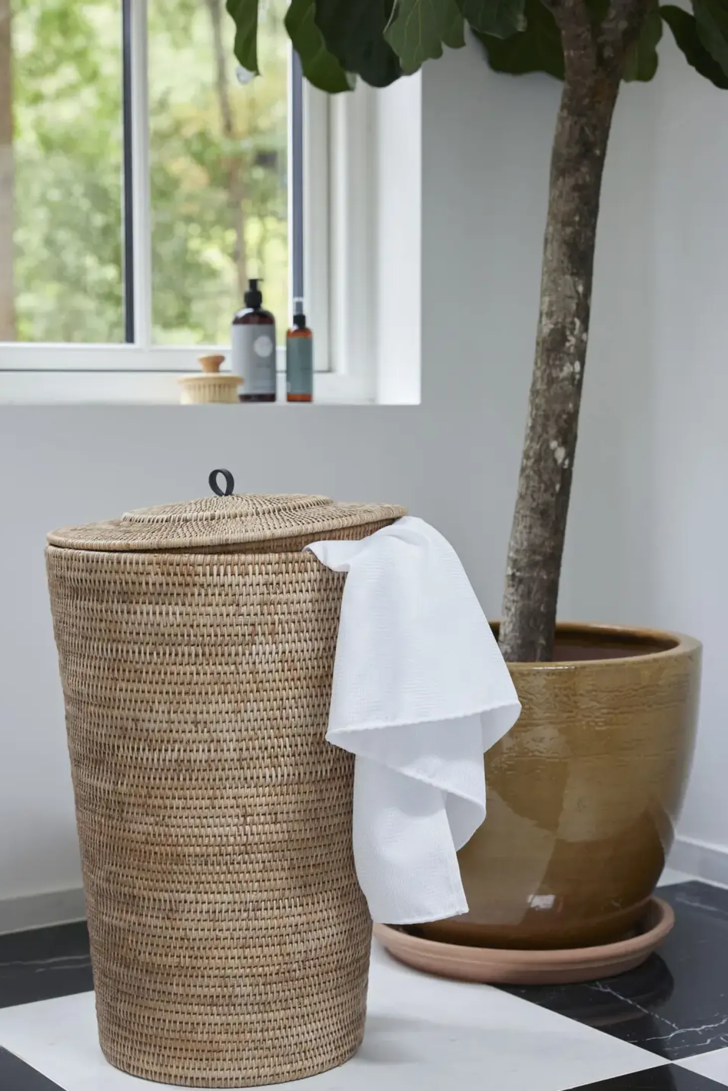 Kurven er flettet meget stamt og med stor præcision, som gør denne vasketøjskurv til et sandt kunsthåndværk. Låg med læderstrop og hvid aftagelig bomuldpose medfølger.