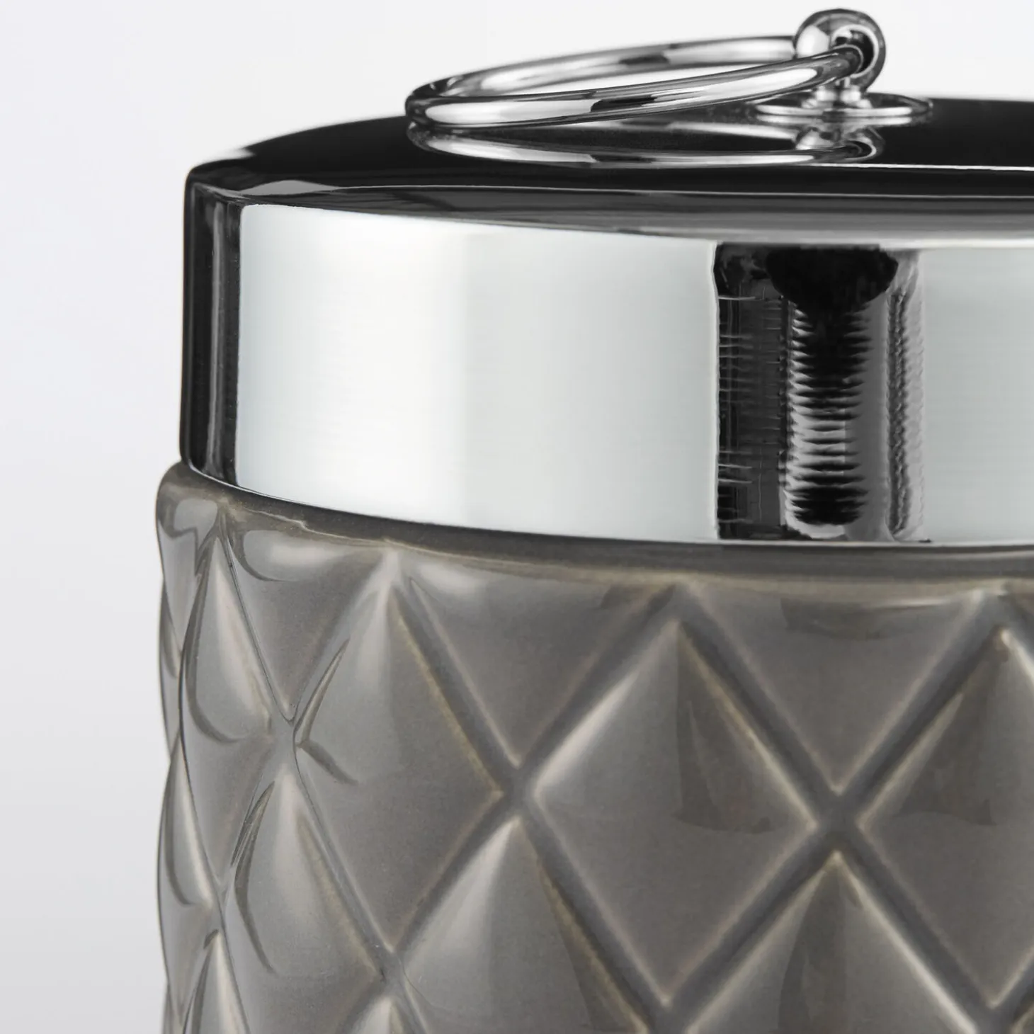 Eksklusiv grå keramik krukke med harlekin design og sølv låg fremstillet af . Denne Portia krukke måler H14xØ9 cm. og er perfekt til opbevaring af småting på badeværelset, hvor den både vil være praktisk og dekorativ på én og samme tid. Brug den eventuelt til smykker, vatpinde, vatrondeller eller til lige hvad du har lyst til.