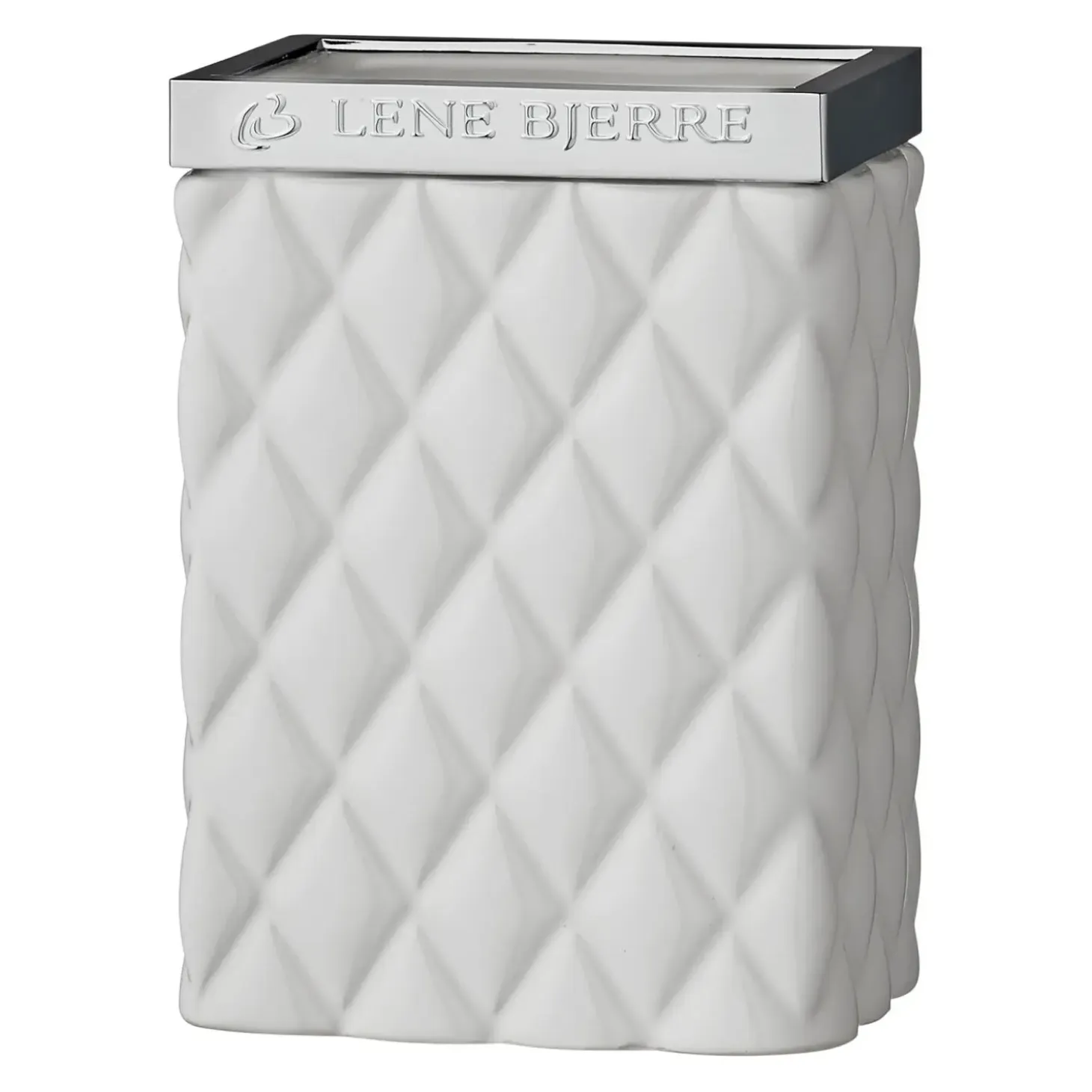 Harlekin mønstret hvid keramik tandkrus med sølv top. Dette Portia tandkrus måler L8xB6xH11 cm. og er perfekt til opbevaring på badeværelset, hvor det vil være både praktisk og dekorativ på én og samme tid. Brug det til tandbørster eller måske til make-up pensler, hårbørster eller noget helt tredje. Hos Lene Bjerre har vi skabt et bredt sortiment af flotte tandkrus, hvor funktionalitet og design er i fokus. Du kan vælge imellem forskellige materialer, farver og designs og dermed nemt og enkelt bringe et nyt udtryk på dit badeværelse.