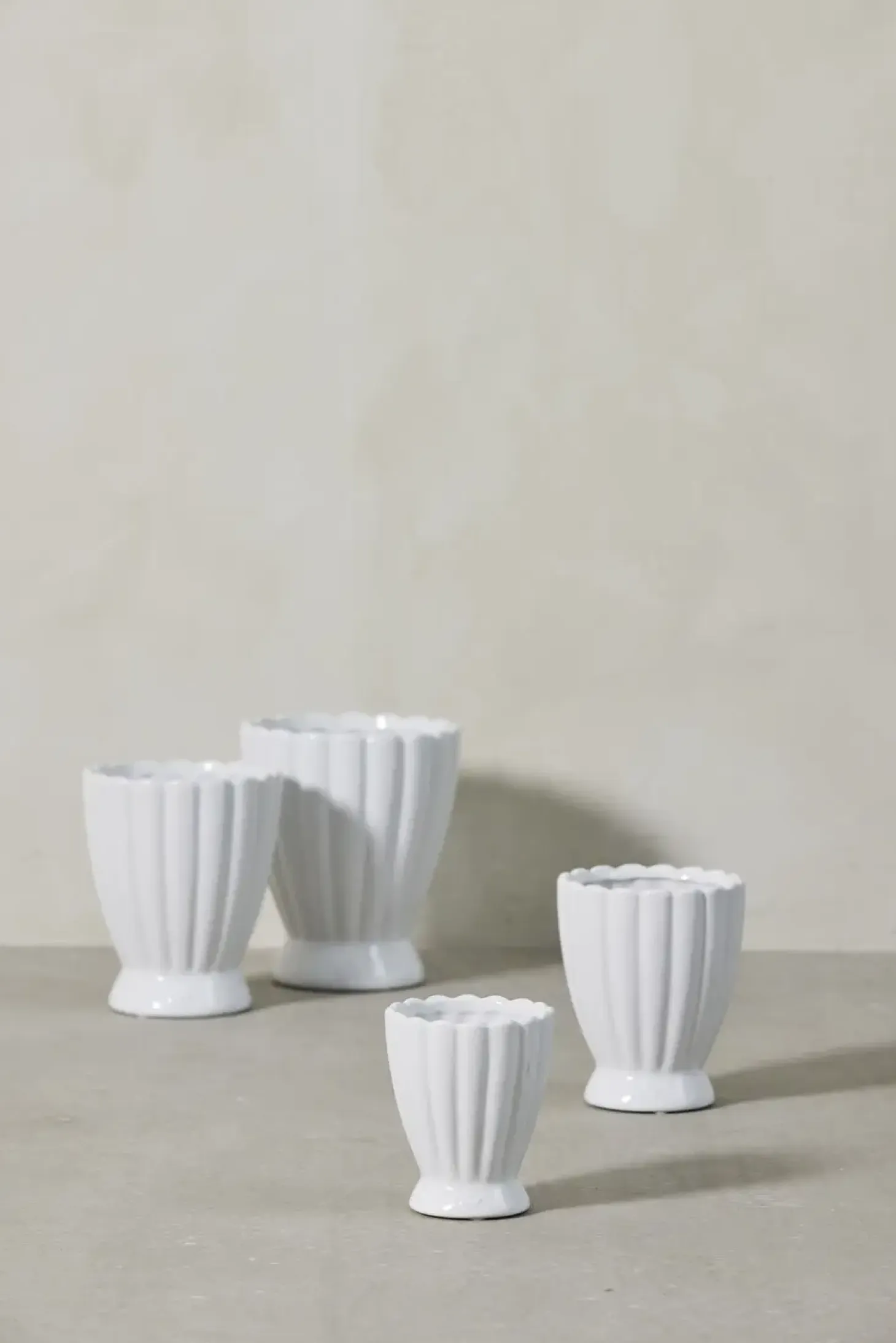 Lene Bjerre – Shenella urtepotteskjuler i hvid keramik tilføjer sofistikeret enkelhed til din boligindretning. Med sin tidløse form og ribbede design fungerer denne skjuler som et smukt supplement til dine planter, både indendørs og udendørs.
