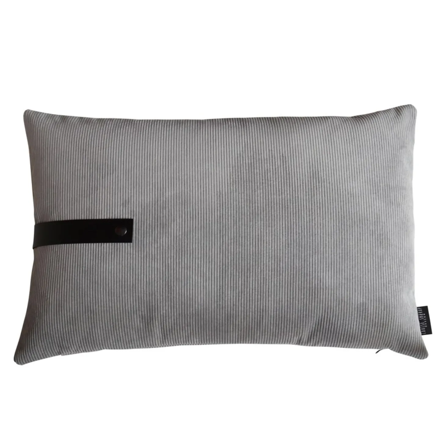 Denne pude fra Louise Smærup er syet i et fløjlstekstil af høj kvalitet, som både er simpelt og elegant. Den kølige lysegrå farve gør det nemt at matche puden med din eksisterende indretning, og den sorte kernelæderrem giver puden det sidste touch.