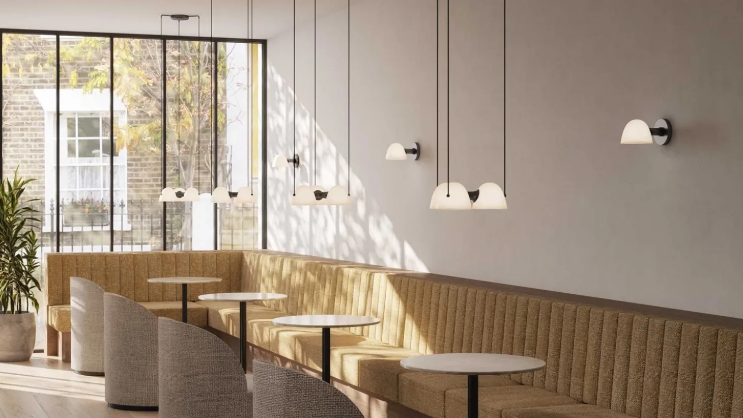 Fra FUSE-kollektionen kommer denne tredobbelte pendel, hvor patineret messing møder trelags opalglas. De tre kuppelformede skærme skaber en harmonisk belysning i dit rum med deres hvide finish.