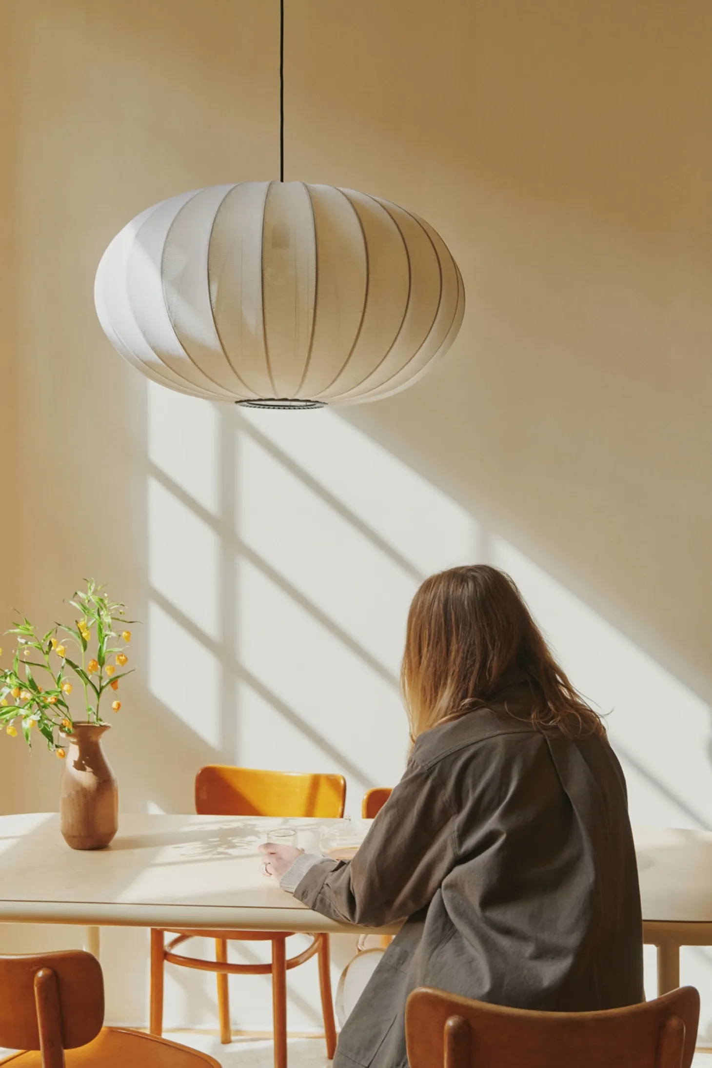 Den ovale Knit-Wit 76 pendel kombinerer moderne strikketeknik med dansk håndværk. Strukturen skaber et særligt lysspil, som giver dit rum en behagelig belysning, der passer til dine behov.