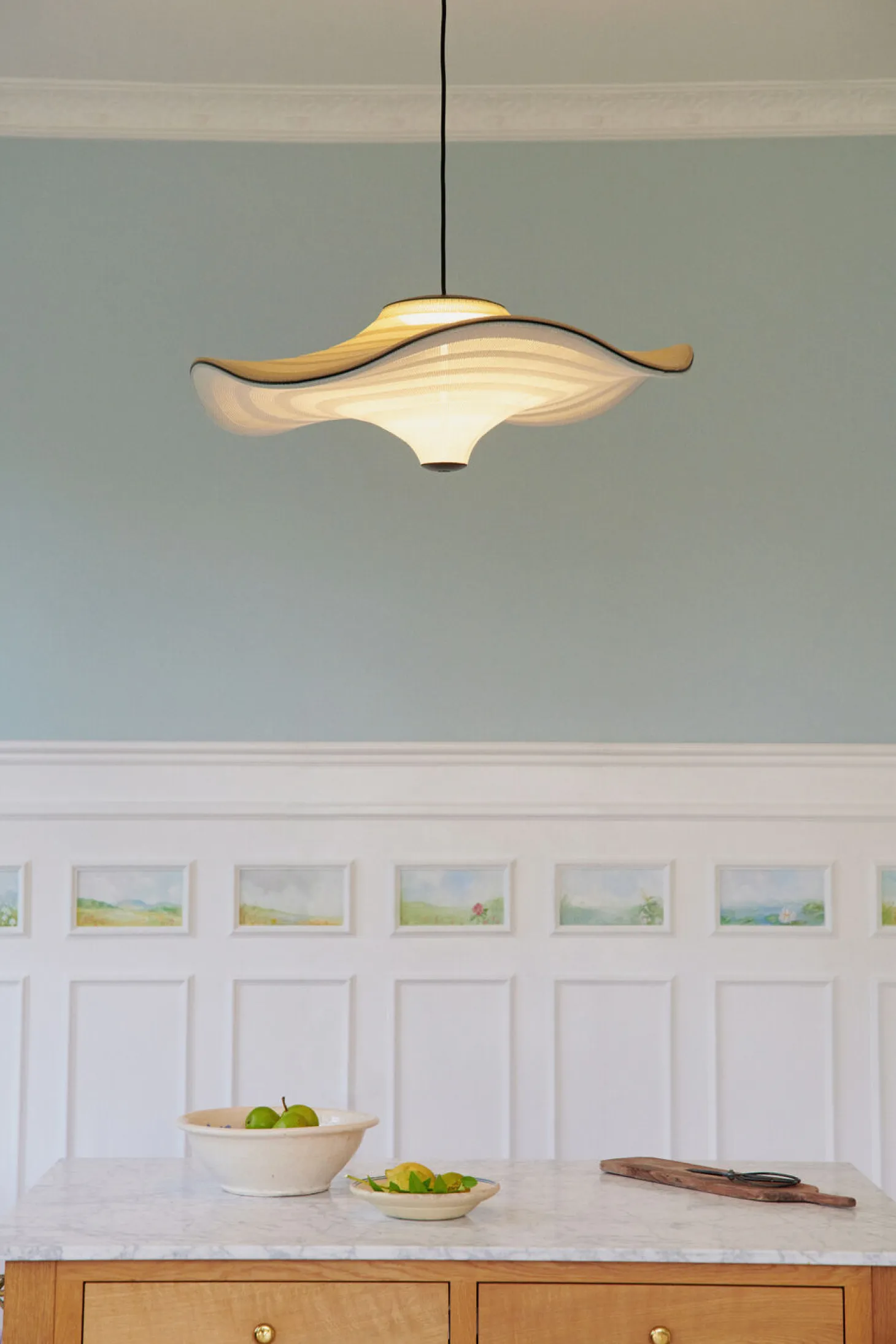 FLYING er en familie af skulpturelle pendellamper med en blød, organisk form. Når de hænger, ser de ud til at svæve smukt i luften. FLYING lamperne er designet, lavet og produceret i Danmark med bæredygtighed for øje. Lampeskærmen er skabt via en 3D-strikkeproces, der omdanner garnet direkte til det færdige produkt, så der ikke går materiale til spilde. LED-lyskilden er indbygget i toppen af lampen og spreder blødt lys gennem den strikkede bund. FLYING lamperne leveres også fladpakket i pap, hvilket gør dem kompakte og mere bæredygtige i forhold til transport og distribution.