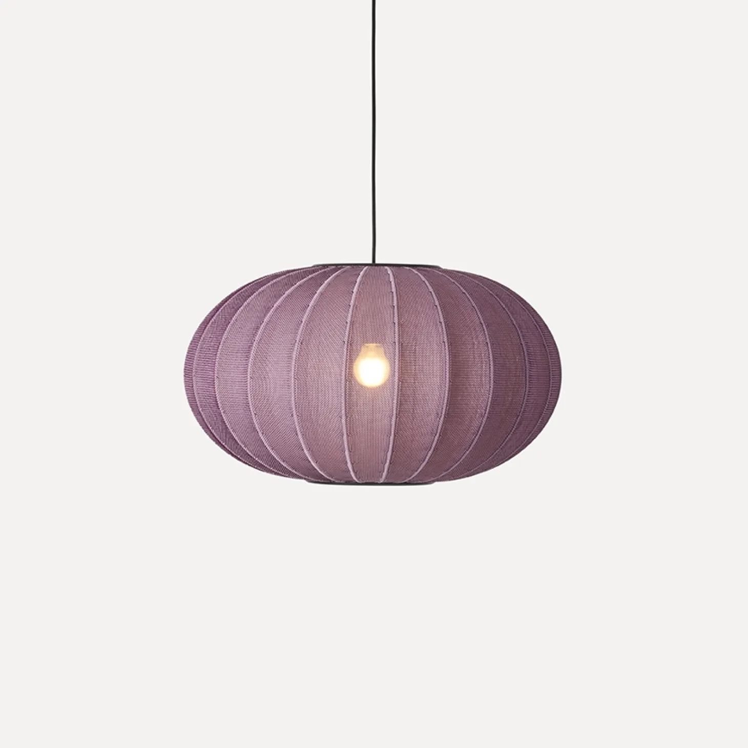 Dansk-produceret pendel med dæmpbart LED-modul til kontrol over belysningen. Den ovale form måler 35 cm i højden og spreder et behageligt lys i burgundy nuancer gennem det strikkede materiale.