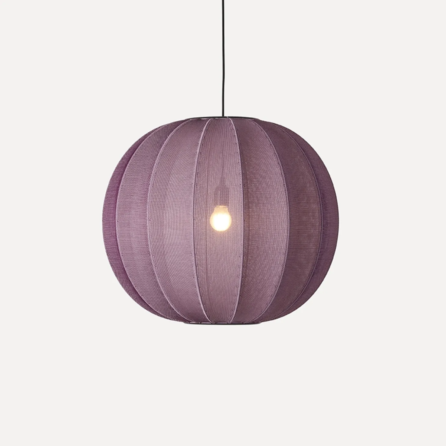 Denne burgundy røde pendel kombinerer 3D-strikket polyester med dansk håndværk. Det brandsikre, genanvendte materiale skaber en særlig lysfordeling gennem den strikkede overflade.