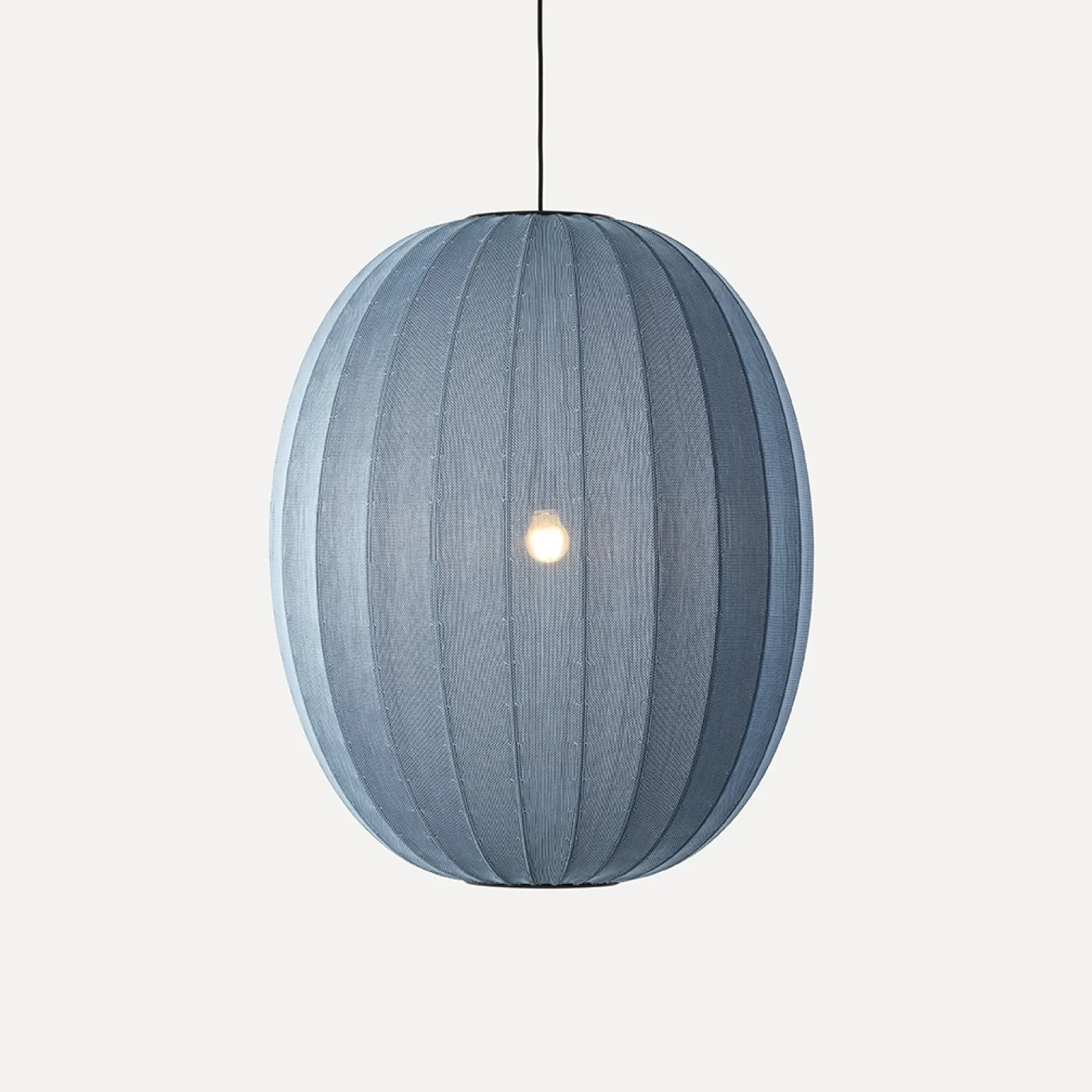 Den ovale form og den strikkede overflade fordeler lyset jævnt i rummet. Teksturen blødgør lyset, hvilket gør lampen velegnet til både spisebordet og opholdsrummet, hvor du ønsker en behagelig belysning.