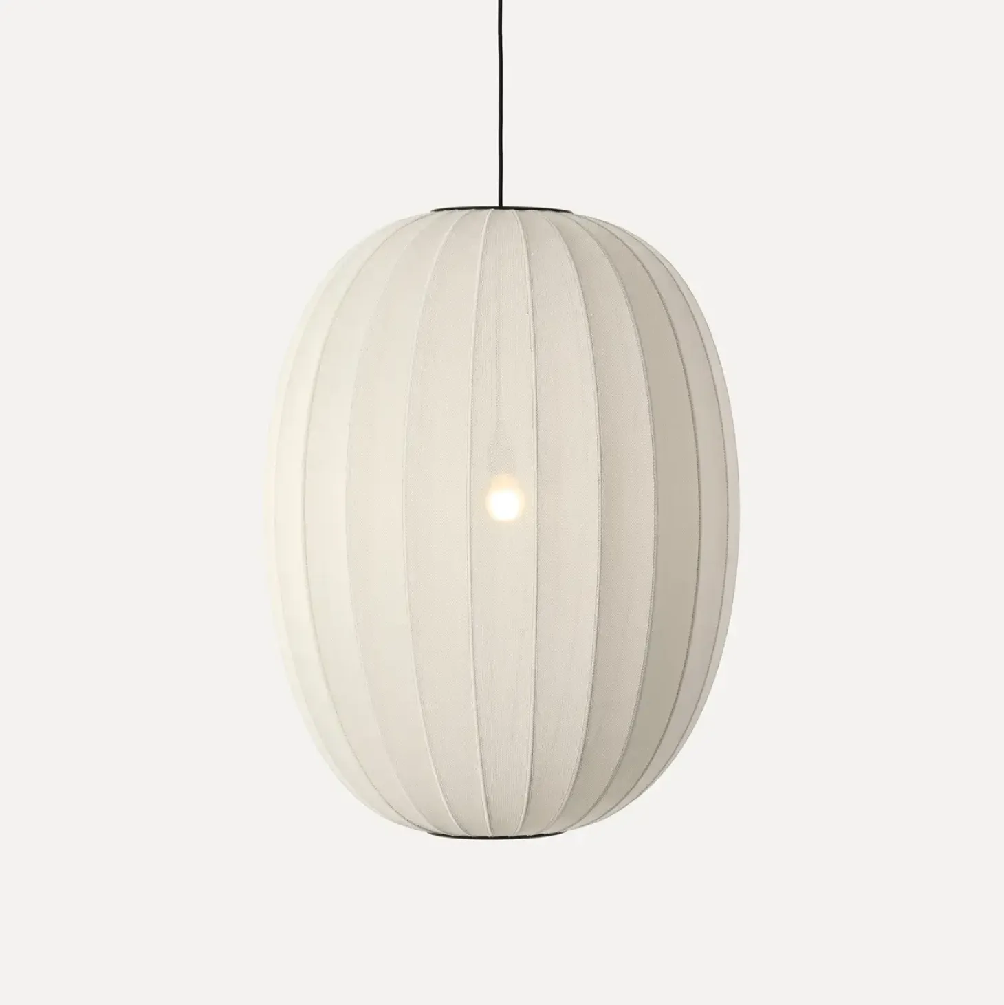 Denne danske pendel kombinerer håndværk med moderne belysning. Den ovale form med lodrette linjer skaber et karakteristisk udtryk, mens den 3D-strikkede overflade fordeler lyset blødt og jævnt gennem materialet.