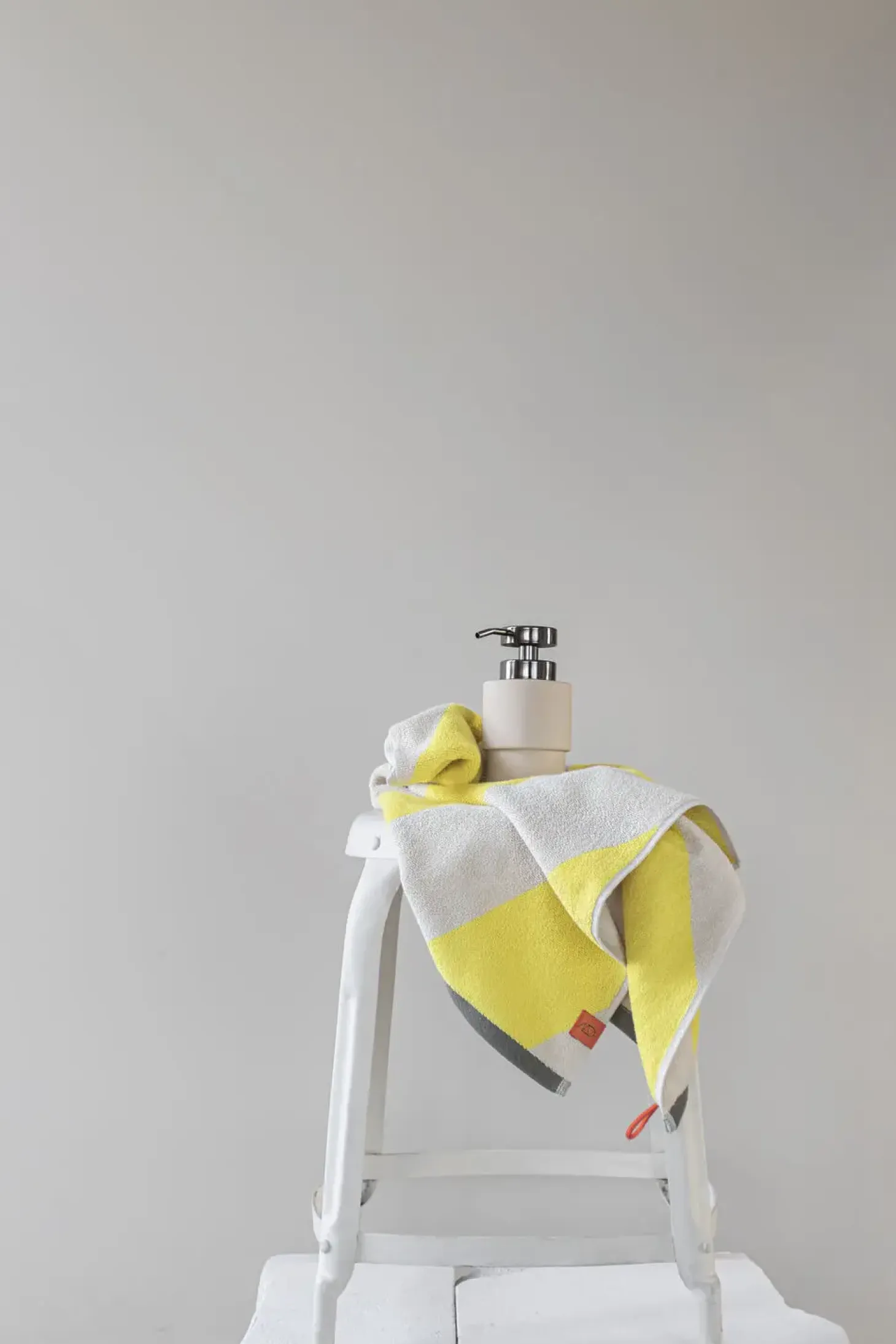Giv dit badeværelse et farverigt og moderne udtryk med DIAGONAL-gæstehåndklædet fra Mette Ditmer. Med sine brede diagonale striber i gul og beige tilfører håndklædet et friskt og energisk look til rummet, mens en olivengrøn bort elegant indrammer designet. Den kontrastfulde orange strop og label fungerer som både en praktisk og dekorativ detalje, der understreger det legende design.DIAGONAL-håndklædet er OEKO-TEX® 100-certificeret og fremstillet af økologisk bomuld, hvilket giver høj kvalitet med en blød og absorberende overflade. Den langfibrede bomuld sikrer både holdbarhed og en følelse af luksus. Mix og match med andre farver i serien for at skabe et personligt og harmonisk badeværelse.For at opnå maksimal absorberingsevne anbefales det at lægge håndklædet i blød i koldt vand i 24 timer inden første vask. Undgå skyllemiddel for at bevare håndklædets optimale kvalitet.