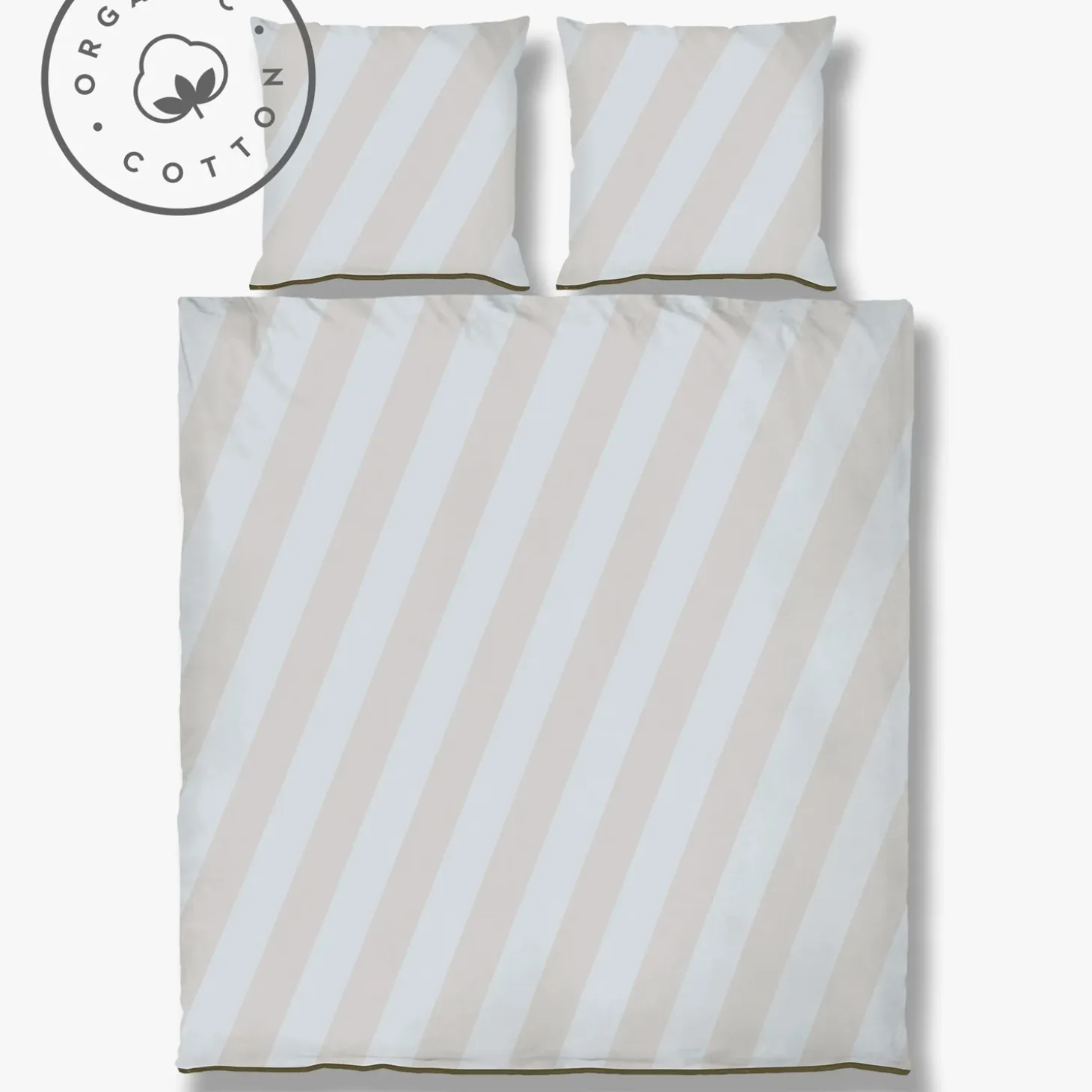 Skab de helt rigtige rammer for en god nats søvn. Der er kræset om både kvalitet og detaljerne i DIAGONAL-sengesættet fra Mette Ditmer, så du er sikret den bedst mulige søvn. Brede diagonale striber i kølig lysegrå og varm sand farve pryder både for- og bagside og farvekombinationen skaber et roligt og harmonisk udtryk i soveværelset. Som en ekstra lille detalje lukkes både pude- og dynebetræk med YKK-kvalitetslynlås i en smuk olivengrøn.