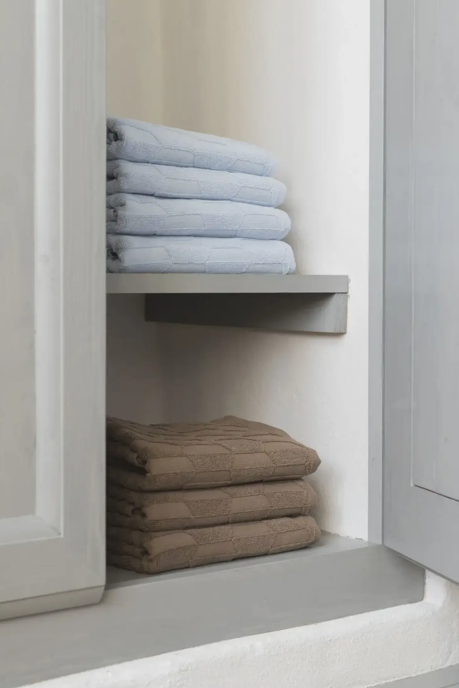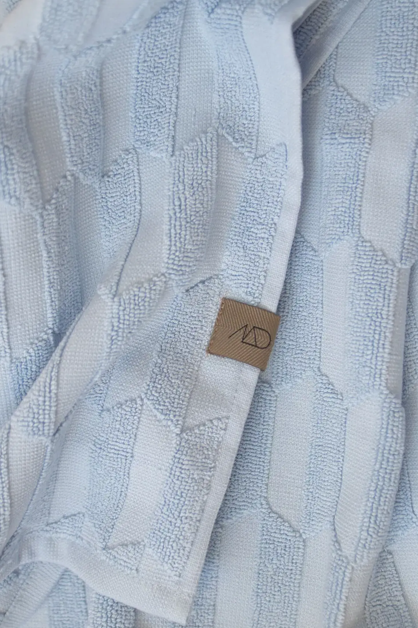 Tilføj et touch af elegance og funktionalitet til dit hjem med Mette Ditmer GEO-håndklædet i en smuk, klar lyseblå farve. Håndklædet er fremstillet med en høj-lav vævningsteknik, der skaber et næsten tredimensionelt, grafisk mønster. Den sekskantede form deles i to halvdele, hvilket giver en visuel dybde med en lys og en mørk side. Dette forbedrer ikke kun håndklædets æstetiske appel, men giver det også en enestående tekstur og følelse.