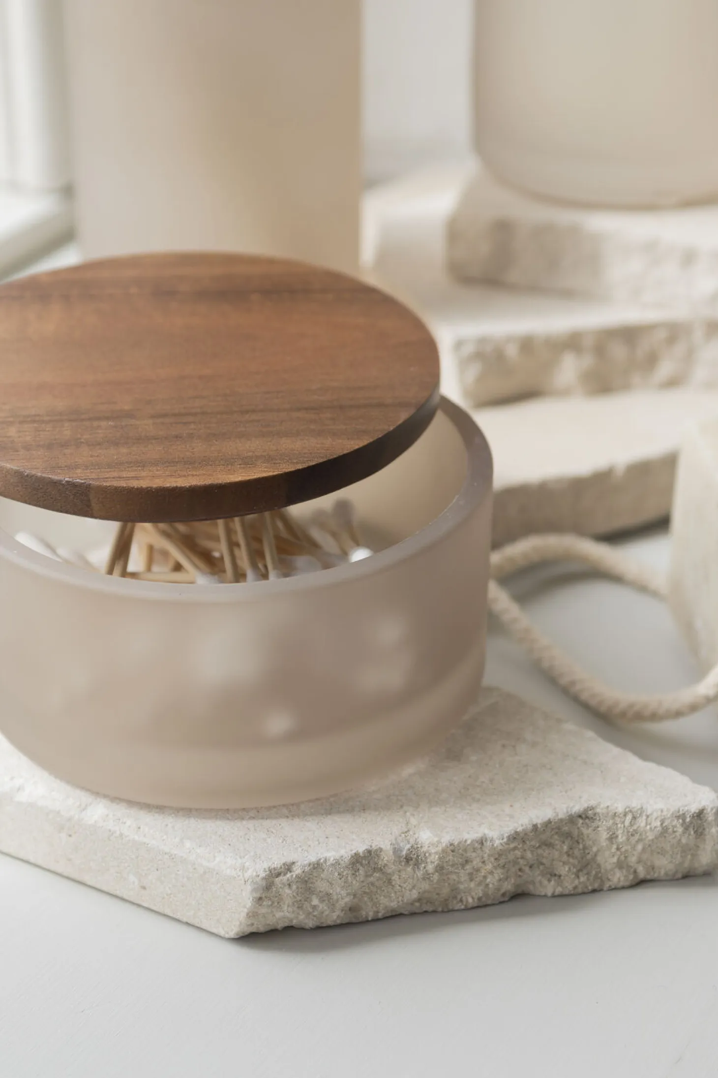 Den stilfulde MODEST-lågkrukke i kitfarve kombinerer naturlig elegance med funktionalitet gennem sit matte, transparente glas og et låg i træ med mat lak. Det diskrete farvevalg og den glatte, afrundede finish på trælåget, der lader træets struktur skinne igennem, tilfører en følelse af naturlighed og ro. Denne krukke er ikke kun praktisk til opbevaring, men også en æstetisk tilføjelse, der smukt harmonerer med det moderne hjem, hvor glas og træ forenes i perfekt balance.