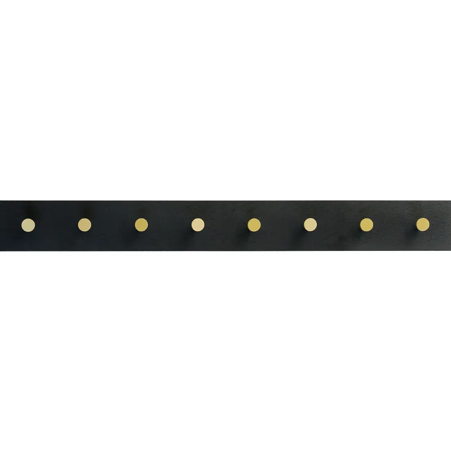 Knagerækken er fremstillet af massivt, FSC-certificeret egetræ, der er overskudstræ fra andre produktioner. Dette understreger produktets bæredygtige profil. De otte messingknager giver rigelig plads til jakker, tasker, håndklæder og andre hverdagsgenstande. Den sorte bejdsning af egetræet, kombineret med de gyldne messingknager, skaber en kontrastfyldt og moderne æstetik, der kan komplementere forskellige indretningsstile.