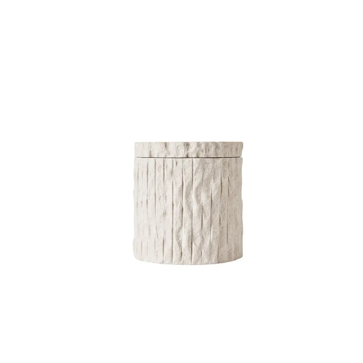 Kama-beholderens riflede overflade giver den en karakteristisk tekstur. Det aftagelige låg sikrer nem adgang til indholdet, mens det samtidig beskytter mod fugt og støv. Kalkstenen giver hvert stykke sin egen særprægede nuance og struktur, hvilket betyder, at farven kan variere.