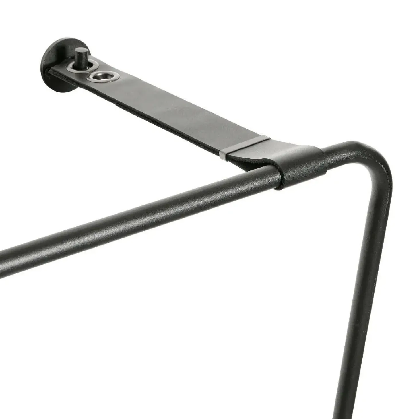Den sorte jernramme giver stabilitet, mens læderstropperne tilføjer fleksibilitet og mulighed for at justere stativet efter behov. De to kroge øverst udvider ophængningsmulighederne og gør det velegnet til både tøj og accessories.