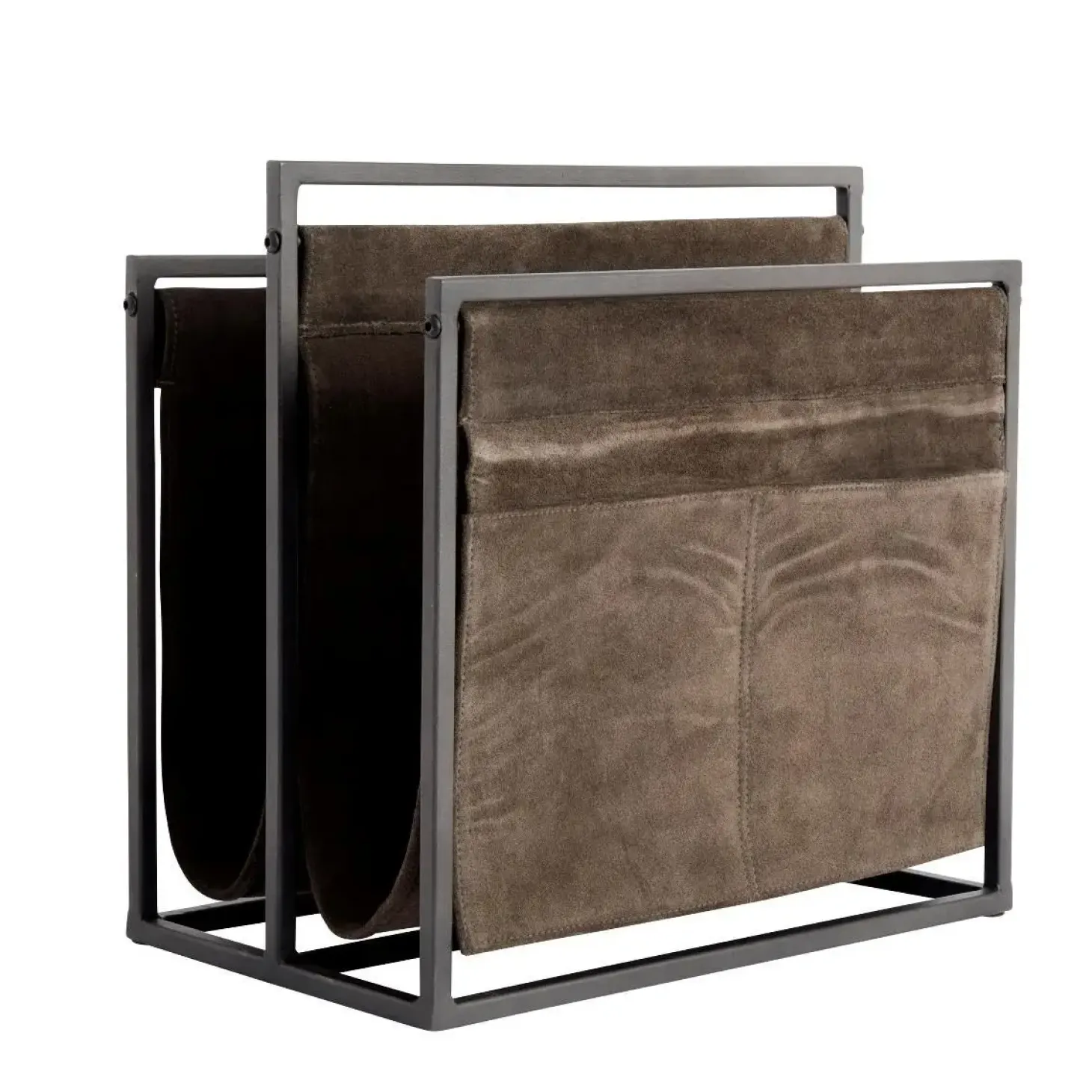 Muubs magasinholder i sort/grå jern og ruskind er en løsning til at organisere dine læsematerialer. Dette design kombinerer funktionalitet med et distinkt udseende, hvilket gør den til et interessant tilbehør i moderne indretninger.